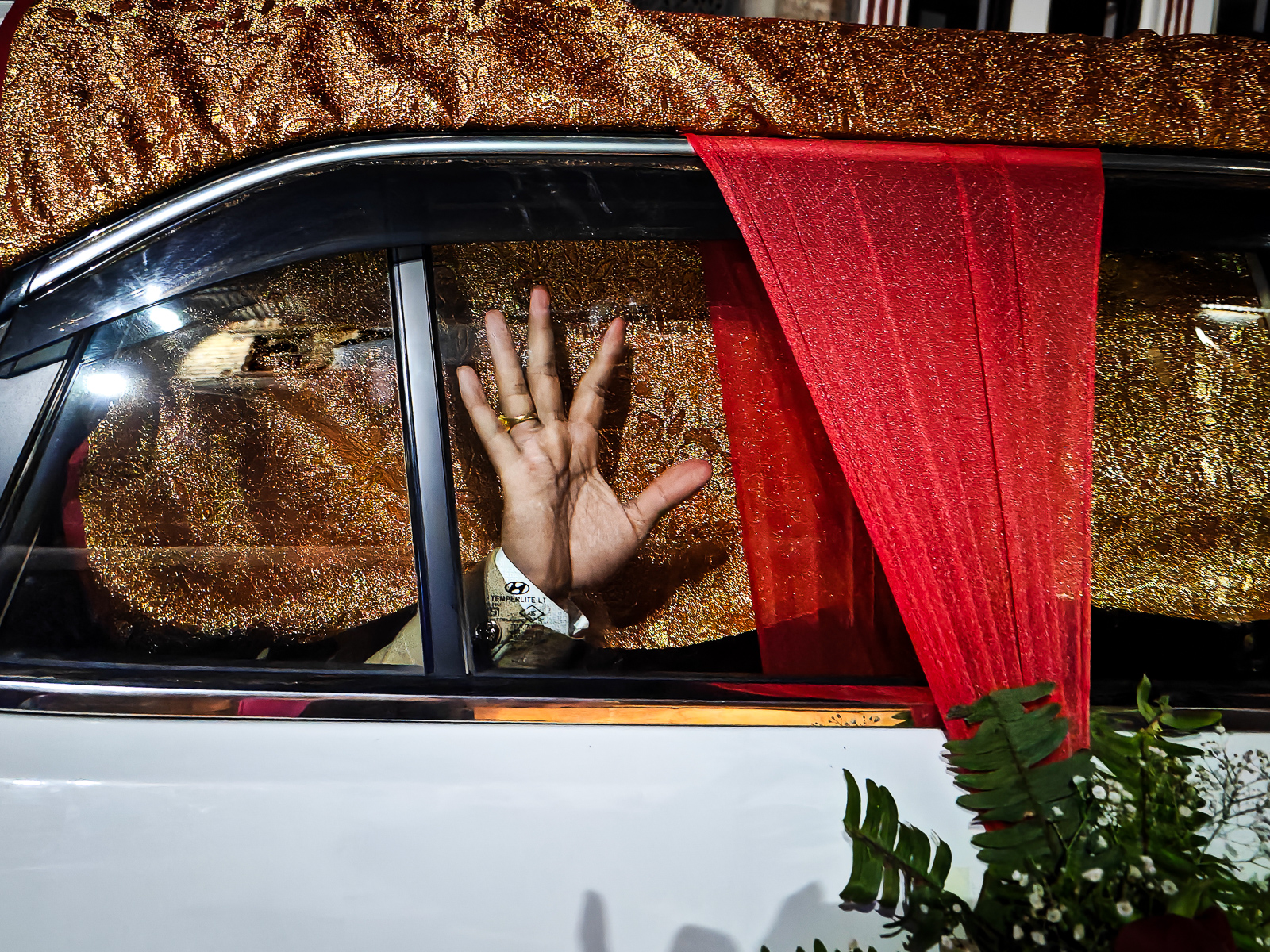 ‘A groom waves enthusiastically while passing by during a ceremonial procession for a wedding in Bhaktapur, Nepal.’