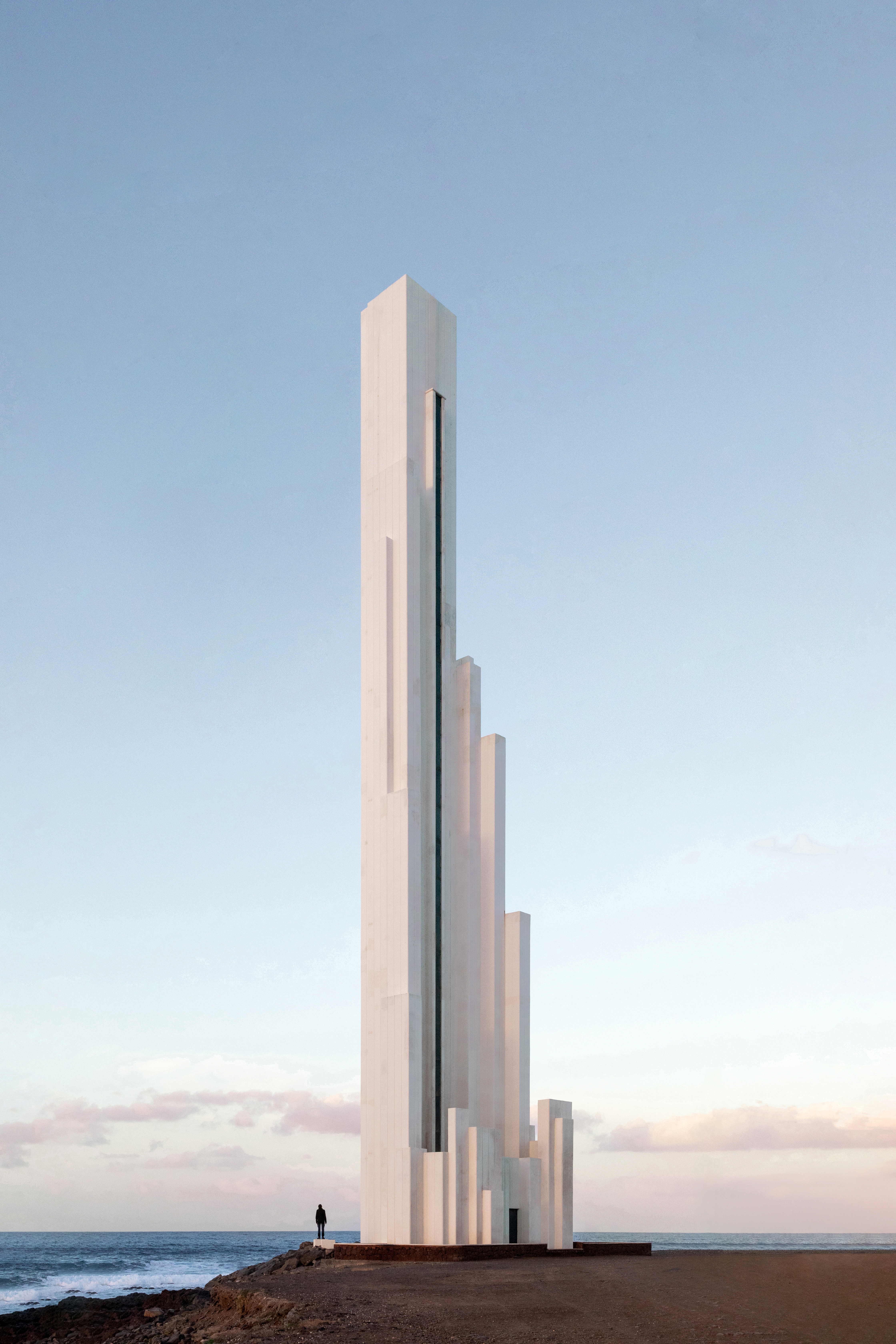 ‘Bathed in soft evening light, a lighthouse rises into the clear sky, its clean, sleek, geometric design contrasting with the coastal landscape. Positioned at its base is a figure – a contemplative man gazing out at the expanse of the ocean before him. The juxtaposition of the solitary silhouette against the infinite horizon creates a moment of reflection and connection with the vastness of the ocean.’