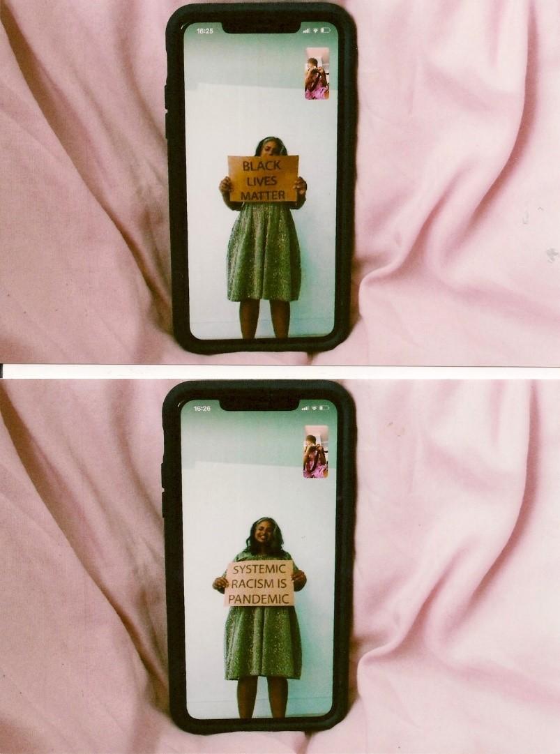 In contrast Kiara Mohamed’s work is unashamedly personal. Kiara is a queer, Black, Muslim artist based in Liverpool who works across photography, film making and poetry. During the pandemic Kiara had to shield for health reasons. As such, her way of connecting is through online platforms such as Zoom. This was a way of Kiara being able to live vicariously through these relationships and to have a presence in these spaces. She captured personal stories of friends, colleagues and others by photographing them on screen. In particular Kiara wanted to highlight how Covid has impacted on BAME individuals and communities.