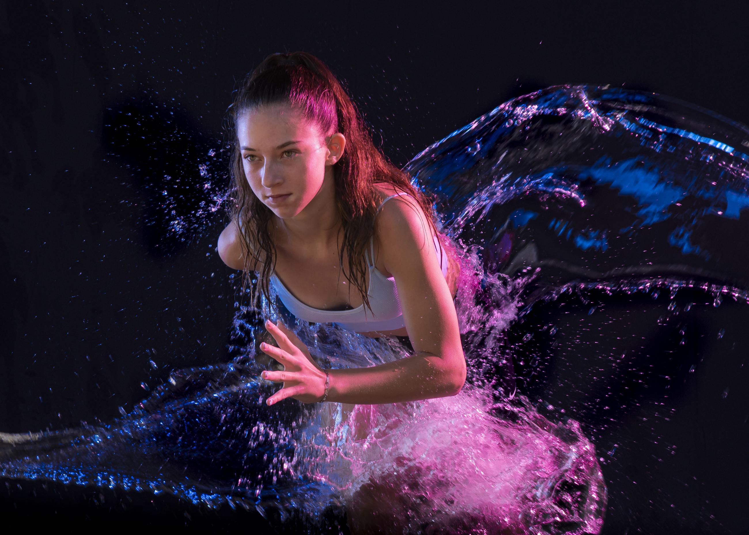 To demonstrate the dynamic nature of this young Swiss athlete I worked with water splashes and gelled lights.