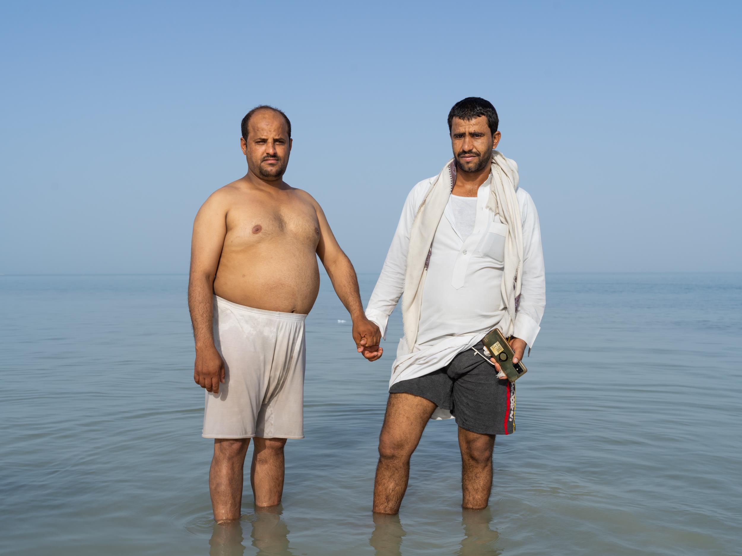 Two migrant workers at the beach during Eid celebrations. Eid is a holiday for all in Saudi and the beaches are full of people from all walks of life, although most say it is still too cold to swim.