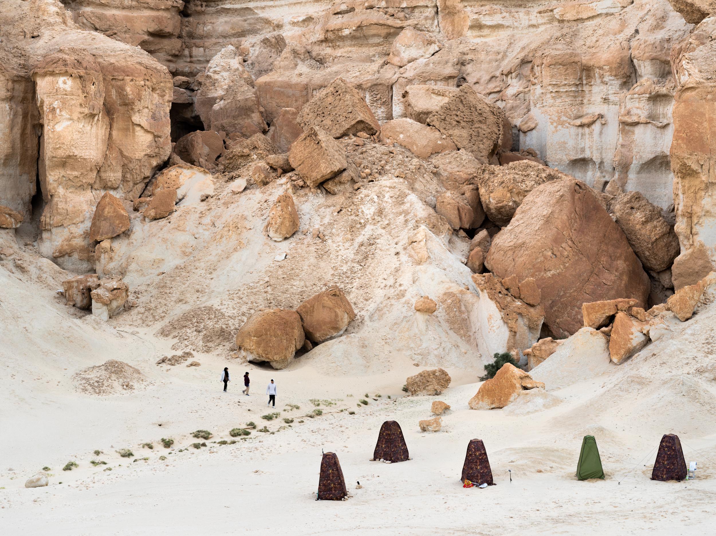 Edge of a campsite and a large landslide in the desert. I had camped nearby myself, after hiking into the desert. Early the next morning I encountered this large group of Malaysians who had also camped overnight to explore the rocks and caves, despite the ominous evidence of enormous landslides.