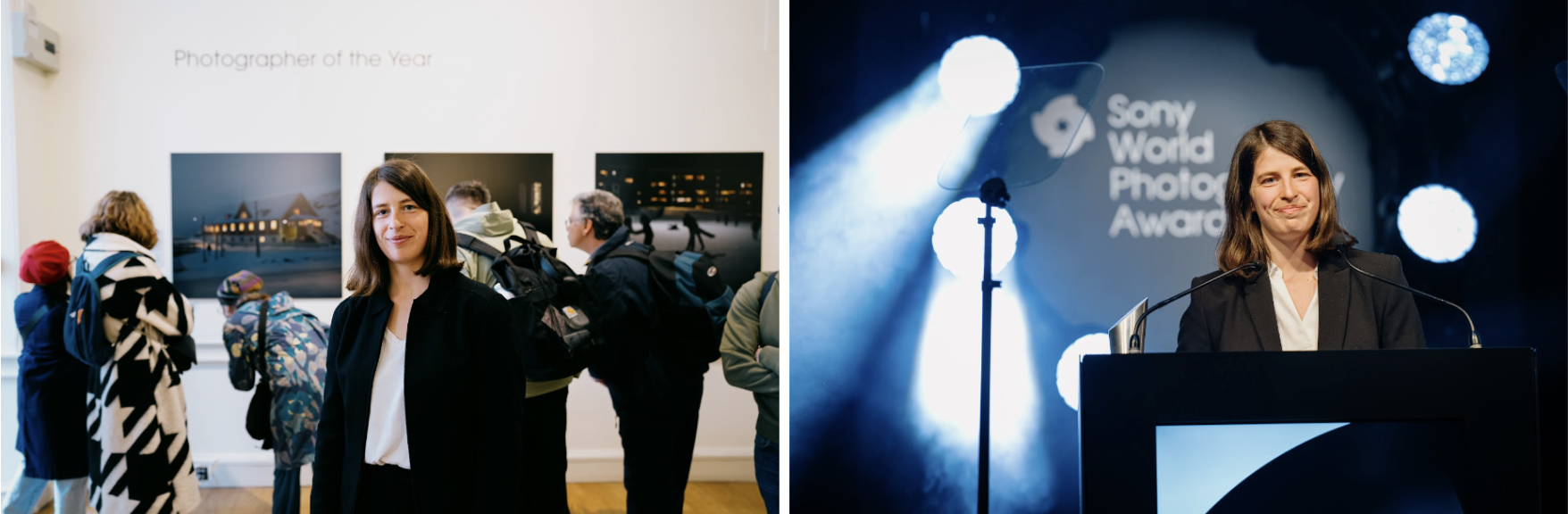 Juliette Pavy (2024 Photographer of the Year) at the London exhibition (left) and awards night (right)