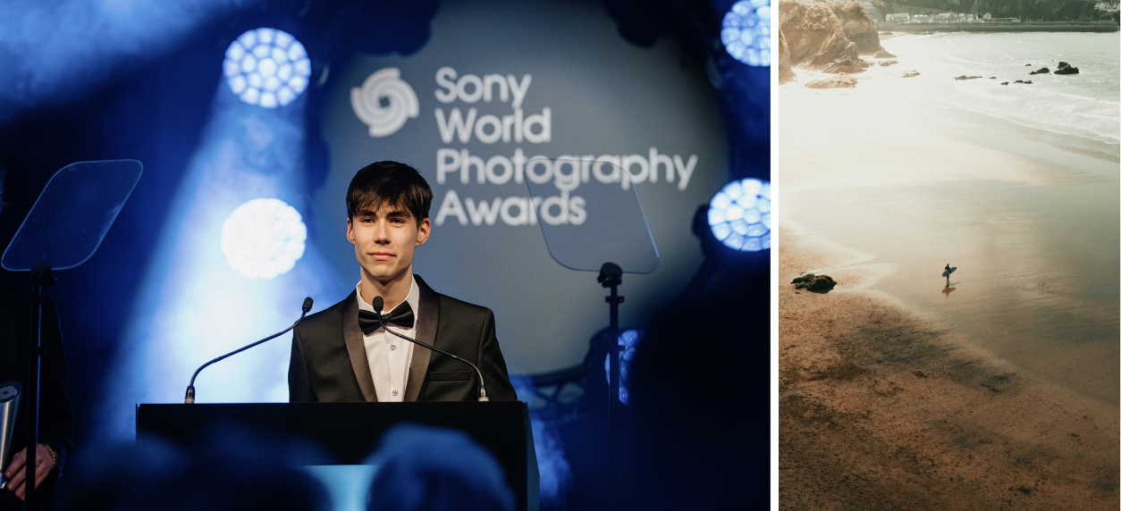 Daniel Murray (2024 Youth Photographer of the Year) at the awards night (left) © Daniel Murray, Sony World Photography Awards 2024 (right)