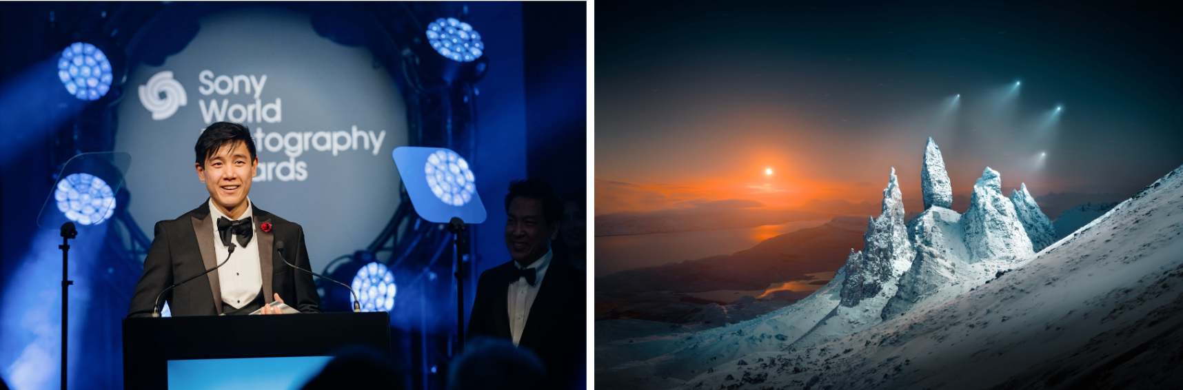 Liam Man (2024 Open Photographer of the Year) at the awards night (left) © Liam Man, Sony World Photography Awards 2024 (right)