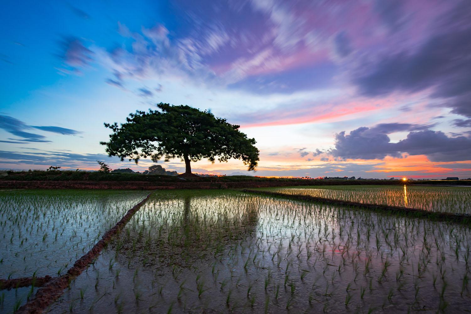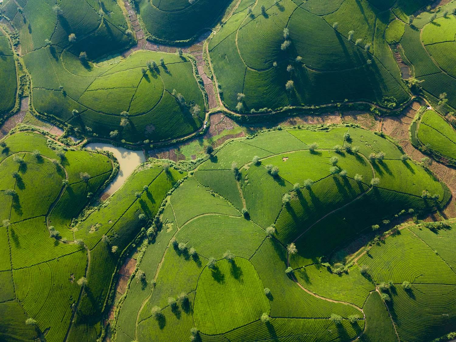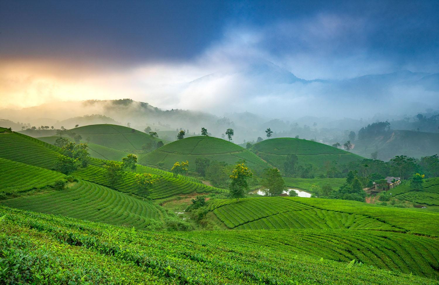 “LongCoc” is the name of the location. I know it because my friend lives there and I visited it a few times. Topographically “LongCoc” is not very high. It has the shape of an upside down bowl, suitable for farmers to grow tea and become one of the biggest locations for exporting Vietnamese tea. It has also very special weather compared to where most people live there. A few times I got up in the early morning, at 3am, to climb to the highest mountain and wait for the best moment. Luckily this time the sunrise with the fog blew up from the ground. The dawn filled the sky with a red colour, and little clouds clustered around the green of the tea mountain... My companions were heading home but I still stood there to find something better. I took this photo when the sunrise was very high over the mountain. It was a moment where I could see the true color of the green tea, with the shadows of the small trees in bloom.