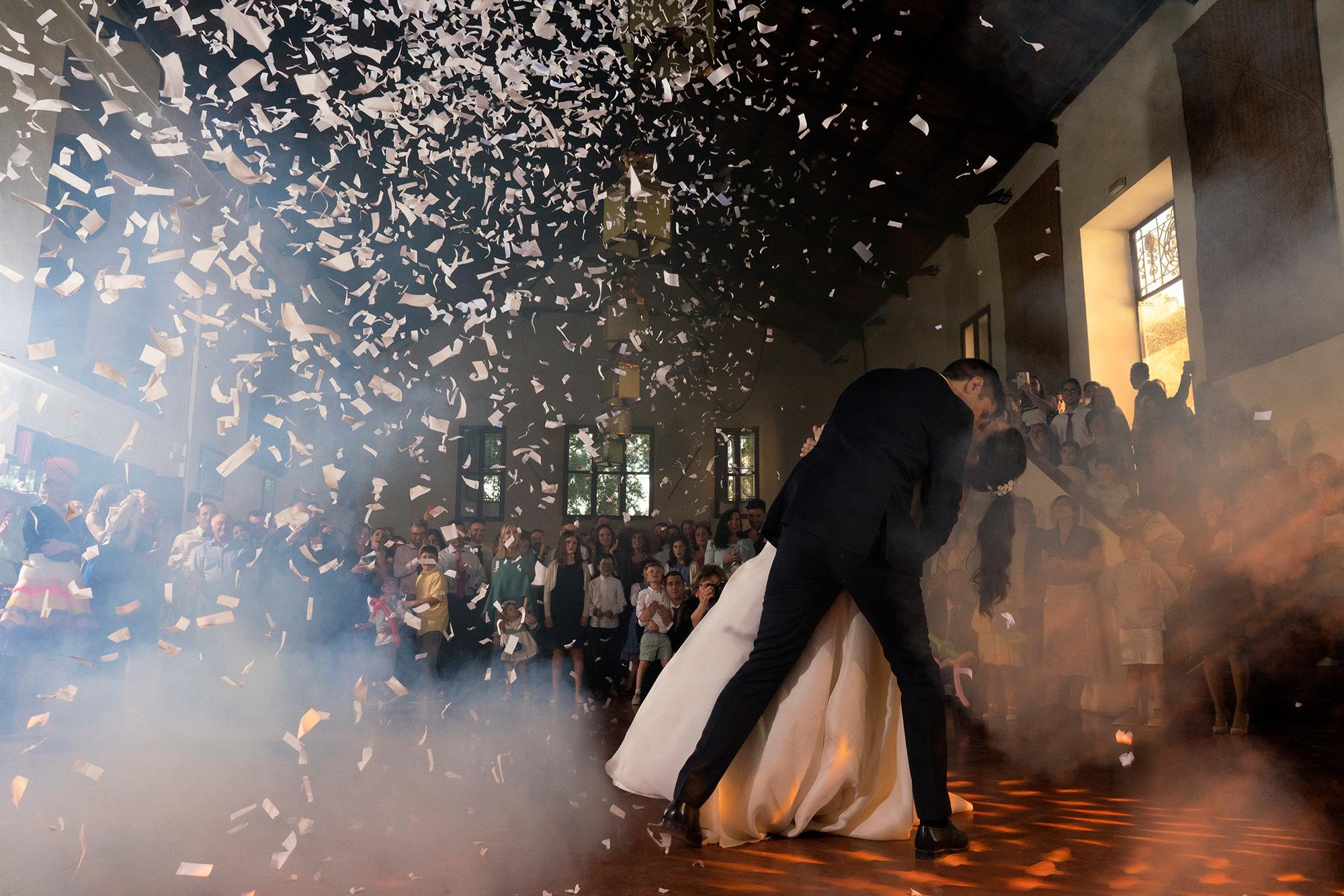 With every new wedding and venue there are new opportunities that allow you to feature a different perspective. For example, I will often talk to the DJ to find out what the bride and groom have prepared for their first dance, in case there is something special planned at the end, like an explosion of confetti. Once I have this information, I can start to work out how to light the room, and where to position myself to capture that moment.