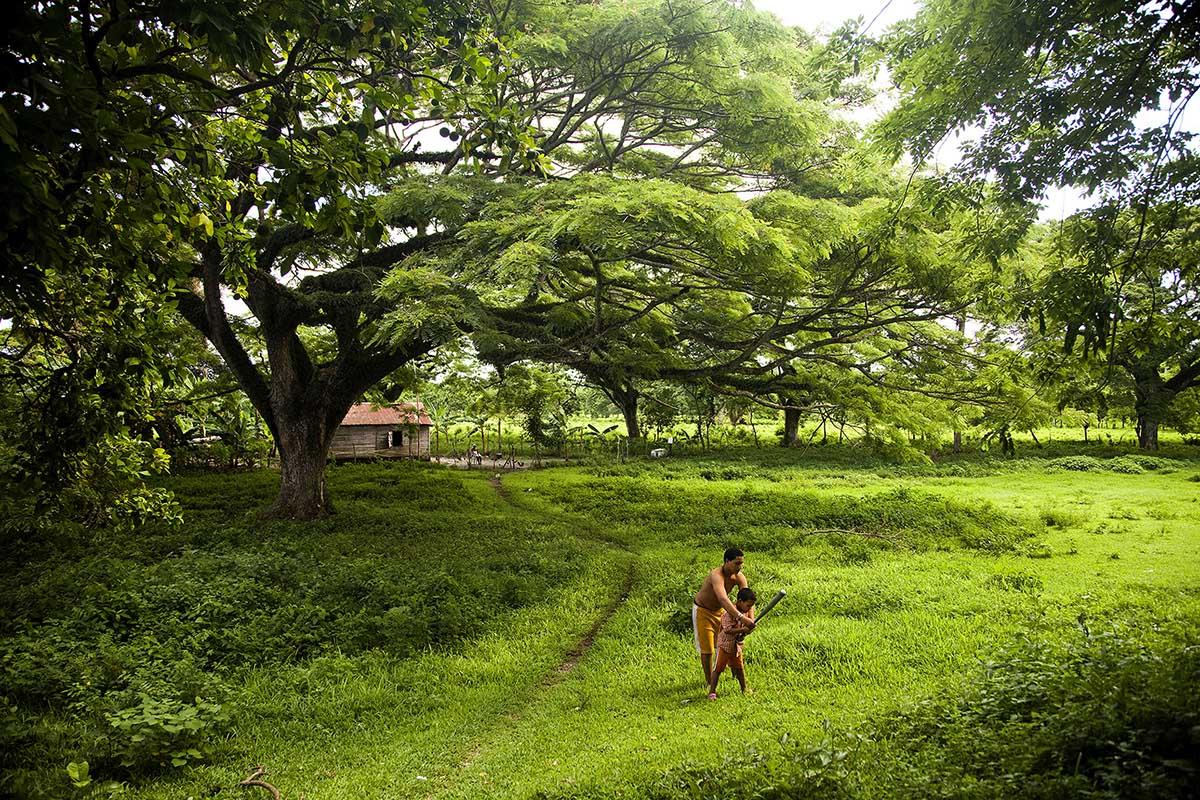 I was driving near Cabarate on the northern coast and noticed this dramatically lush yard in front of a small home. Outside a father was teaching the son how to hit the ball. I thought the scene was unique. A beautifully lush landscape with a small home tucked under a tree. Baseball represents a ticket for many families to escape poverty.