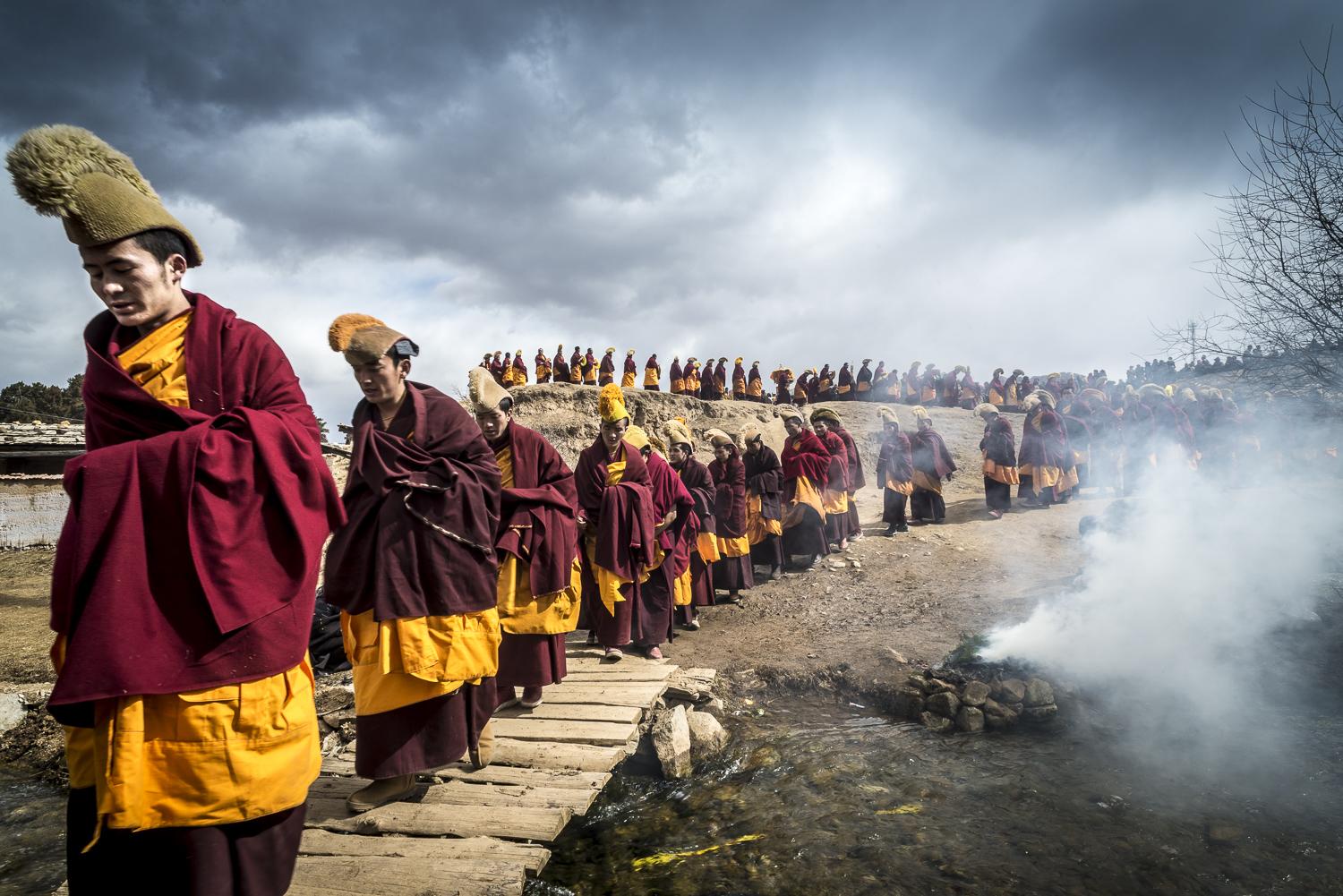 To capture this photograph I placed myself at the end of a small footbridge and crouched low so as to get the diagonal line of monks crossing the frame. The dramatic sky and smoke from the nearby fire were an added bonus.