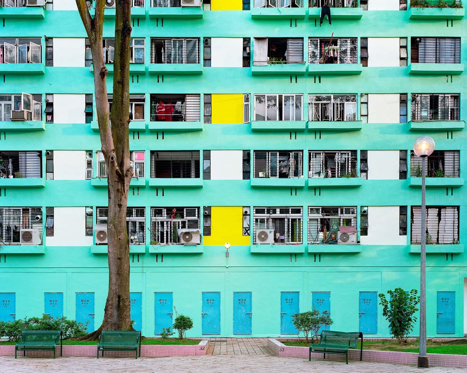 BLOCKS is about the public housing in Hong Kong where nearly one third of the population is living. I have spent most of my life in public housing so I know well that the decors of the building attempt to provide a happier environment for people who feel desperate about living inside. Over the years the government has tried to improve them by refurbishing the hardware and repainting the exteriors of the older housing estates with vibrant colours. But this cannot cover up the dark reality: low-income, unemployment, disabilities, family problems, new immigrants, and the ageing population of the residents. An eerie melancholia permeates these blocks, in sharp contrast with their bright facades. I want to show this absurdity with my images.