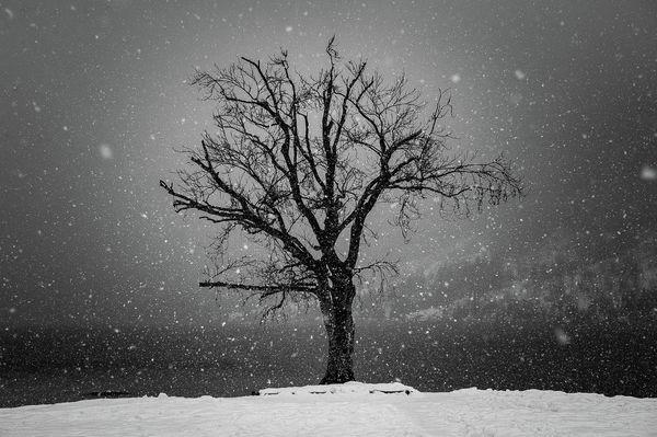 Tree by the lake on a snowy winter day. Bohinj lake, Slovenia