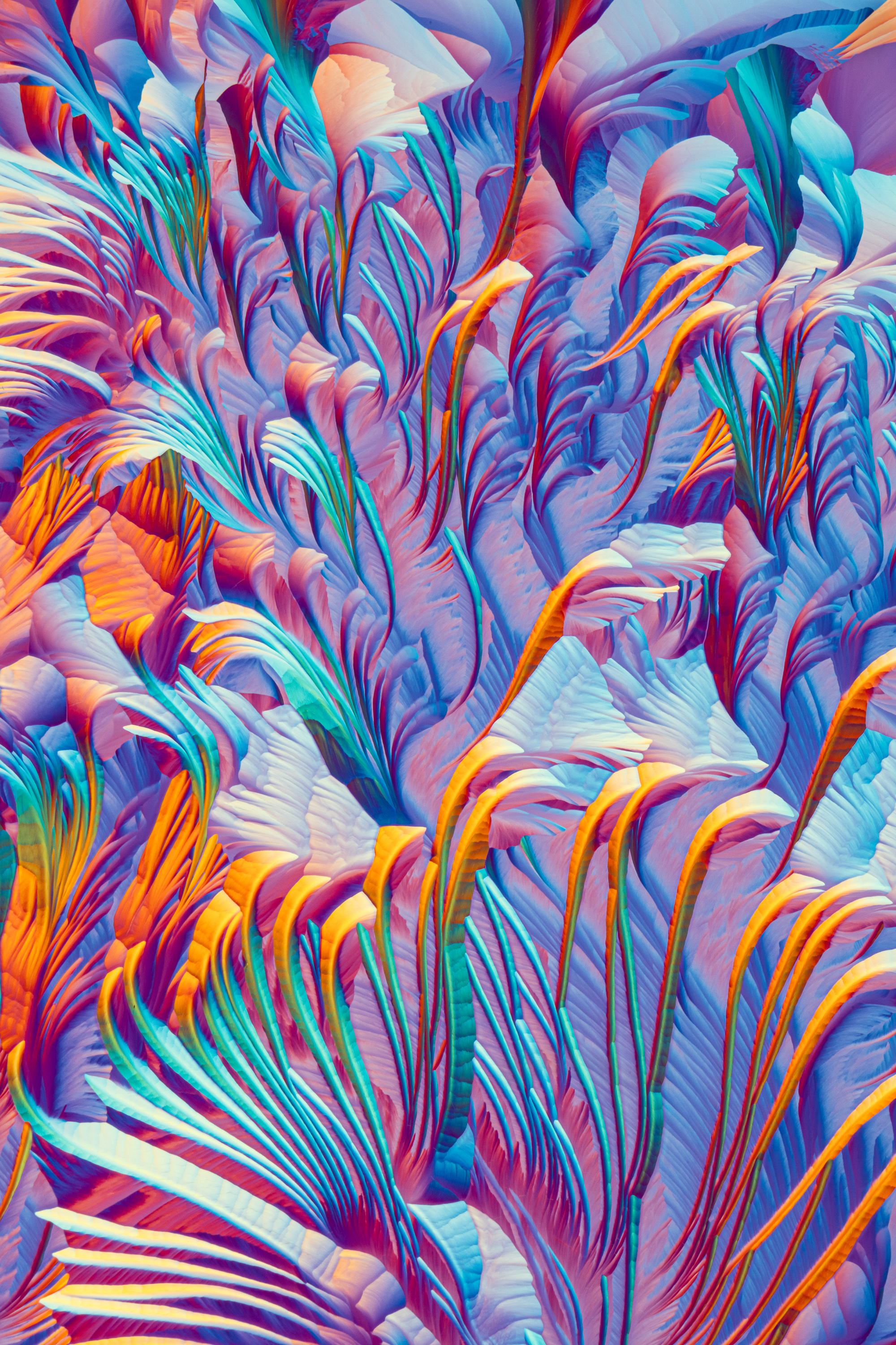 ‘A 5x enlargement of crystals of amino acids (B-alanine, L-glutamine and glycine), photographed with the help of polarising filter.'