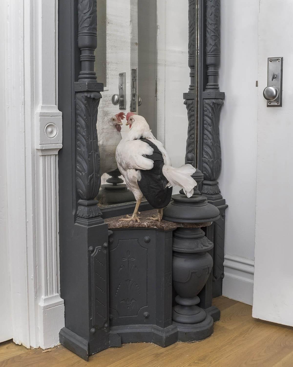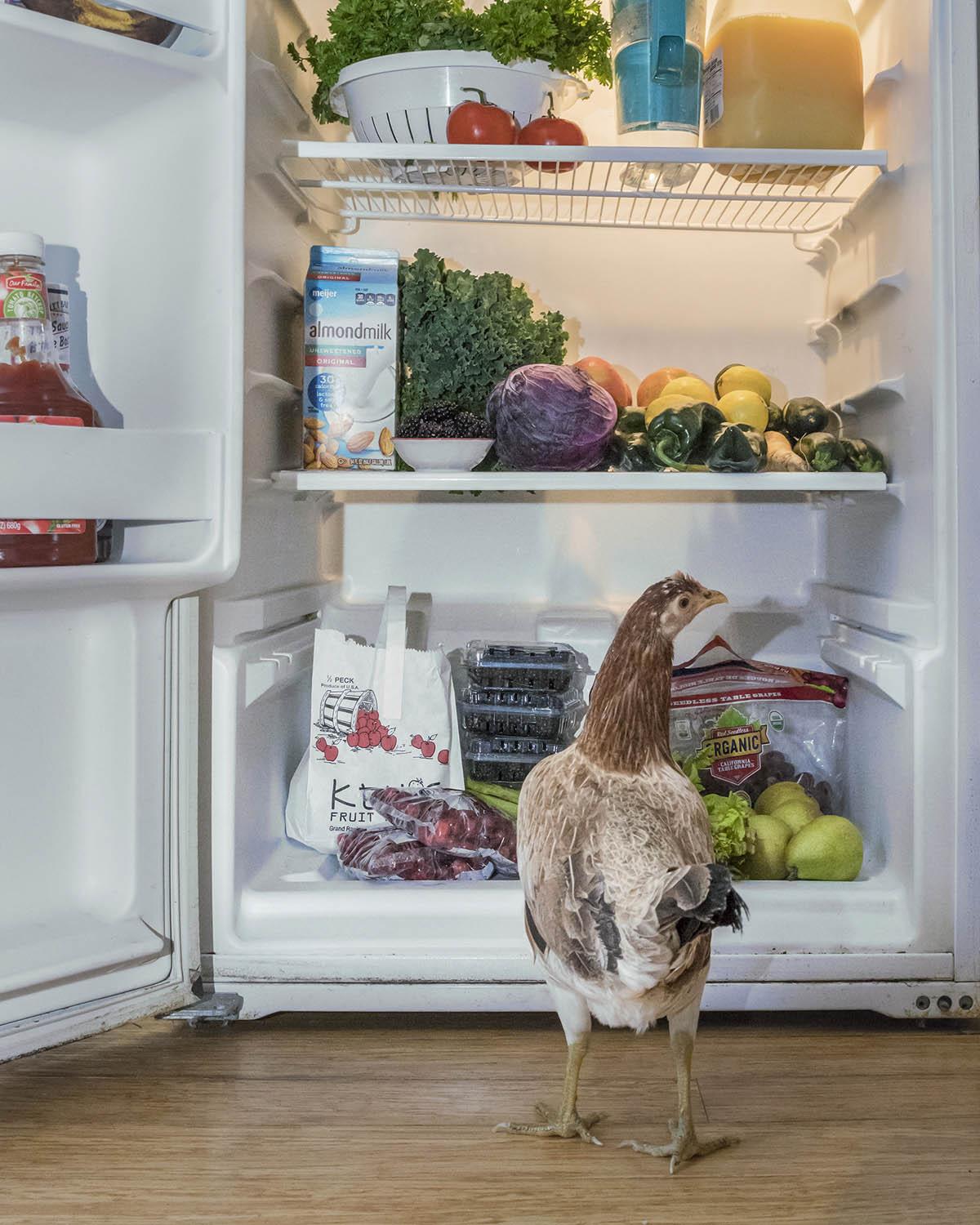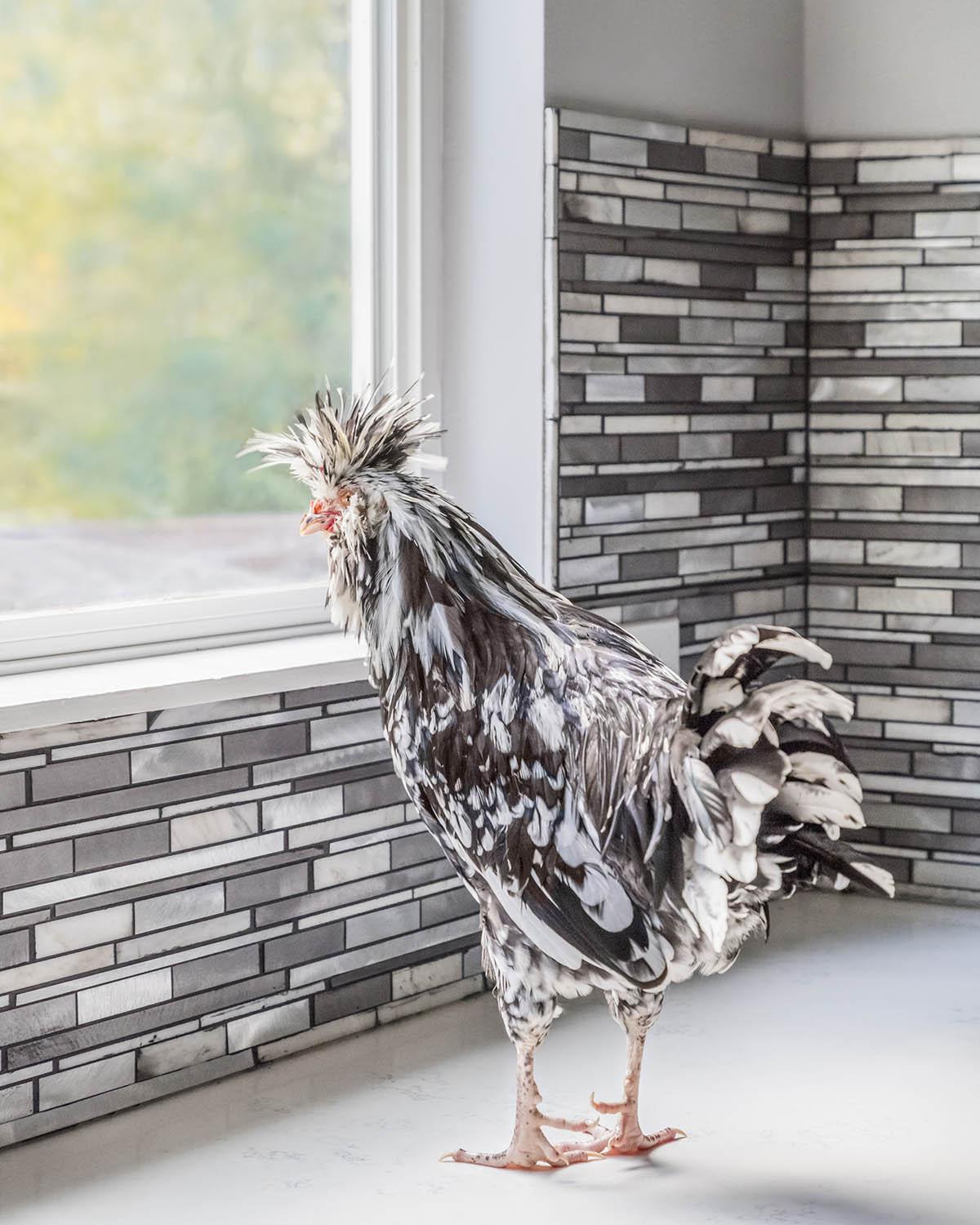 The greatest challenge is one I face when photographing any animal: how do I make photographs responsibly and respect my subjects’ autonomy when I don’t speak “chicken” or “pig” or “sheep”? I try to start photo sessions by sitting with the chickens I’m photographing, witnessing their existence and valuing their importance as individuals, not purely as subjects to photograph. I also invite them to connect with me through sight, smell, touch and taste – on their own terms and in their own time. When possible, I try to make portraits at eye level to emphasize the parity between (human) viewer and subject, and of course I work closely with their human guardians who are better at interpreting their chicken family members’ actions and speech. I watch for signs that the chickens do or don’t want to participate in the portrait session and respect their decision.