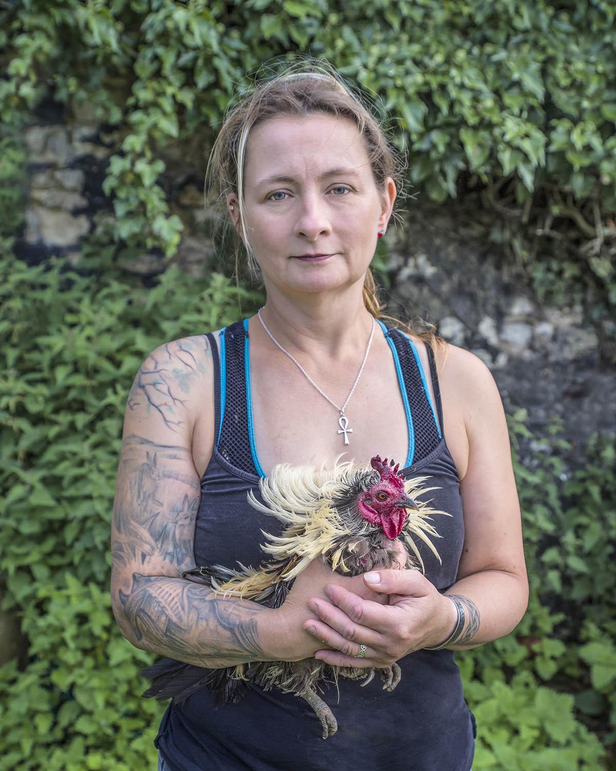 This series is part of a larger project about chickens and their rescuers. I started it in early 2017, soon after I met a hen suffering severe reproductive illness. As I got involved with searching for someone who could adopt the hen and pay for her ongoing veterinary care, I discovered a network of vegans (primarily women) who rescue and care for chickens in their homes. I thought about how so many women still struggle to control their own bodies and obtain adequate healthcare, and in turn how people are socialized to exploit hens’ reproductive systems (by consuming eggs). Even across species, society expects to dictate how females use their bodies. I decided to make portraits of chickens and their rescuers to honor them. and raise awareness of how chickens suffer because of the egg industry.
