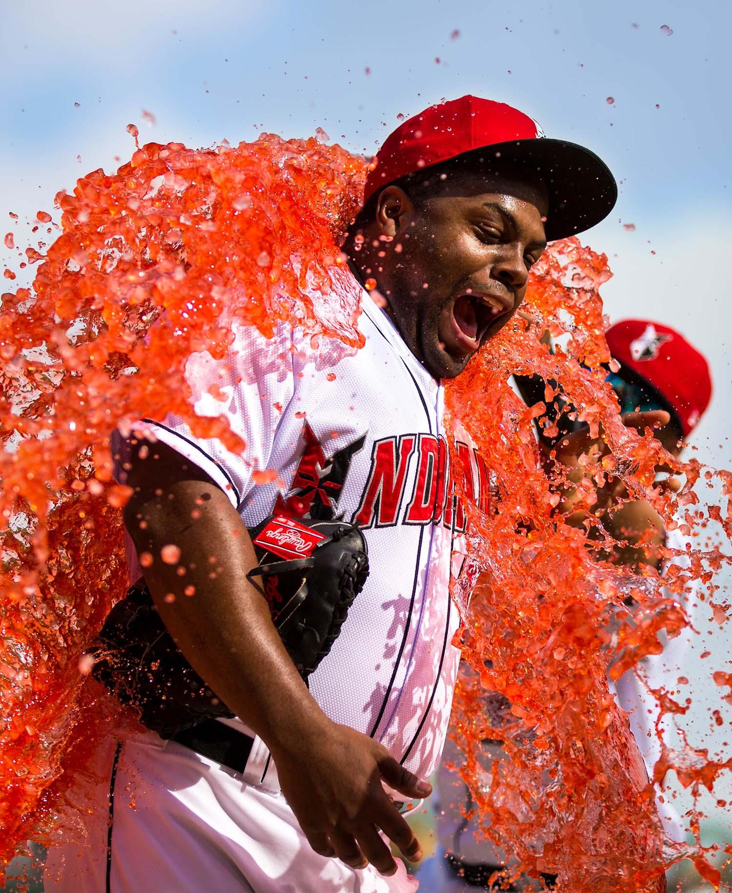 "Tense moments, agonizing defeats and thrilling victories are all for a genuine love for the game of baseball. What became an Indianapolis Indians tradition after each win late in the 2016 season, carried into 2017 as Jason Rogers is doused with Gatorade by Elias Diaz." - Adam Pintar