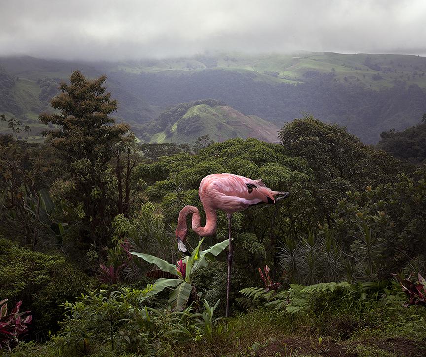In the summer of 2012, I attended an artist residency, Odysseys Artist Residency, located in the Cloud Forest of Costa Rica. I was very taken by the beauty of this ‘cloudy’ forest. It was moody, often monochromatic because of the density of the clouds. It had a captivating, romantic feel. The Cloud Forest is at high elevation and the terrain is varied with jungles, fields, villages, etc. When I returned to NY, I was wondering what I could do with these landscapes that I photographed. Shortly after, I was wandering through the Bronx Zoo and came upon flamingos. The flamingos’ sculptural forms and vibrant pinks seemed to be a striking contrast against the subdued background of the Cloud Forest.