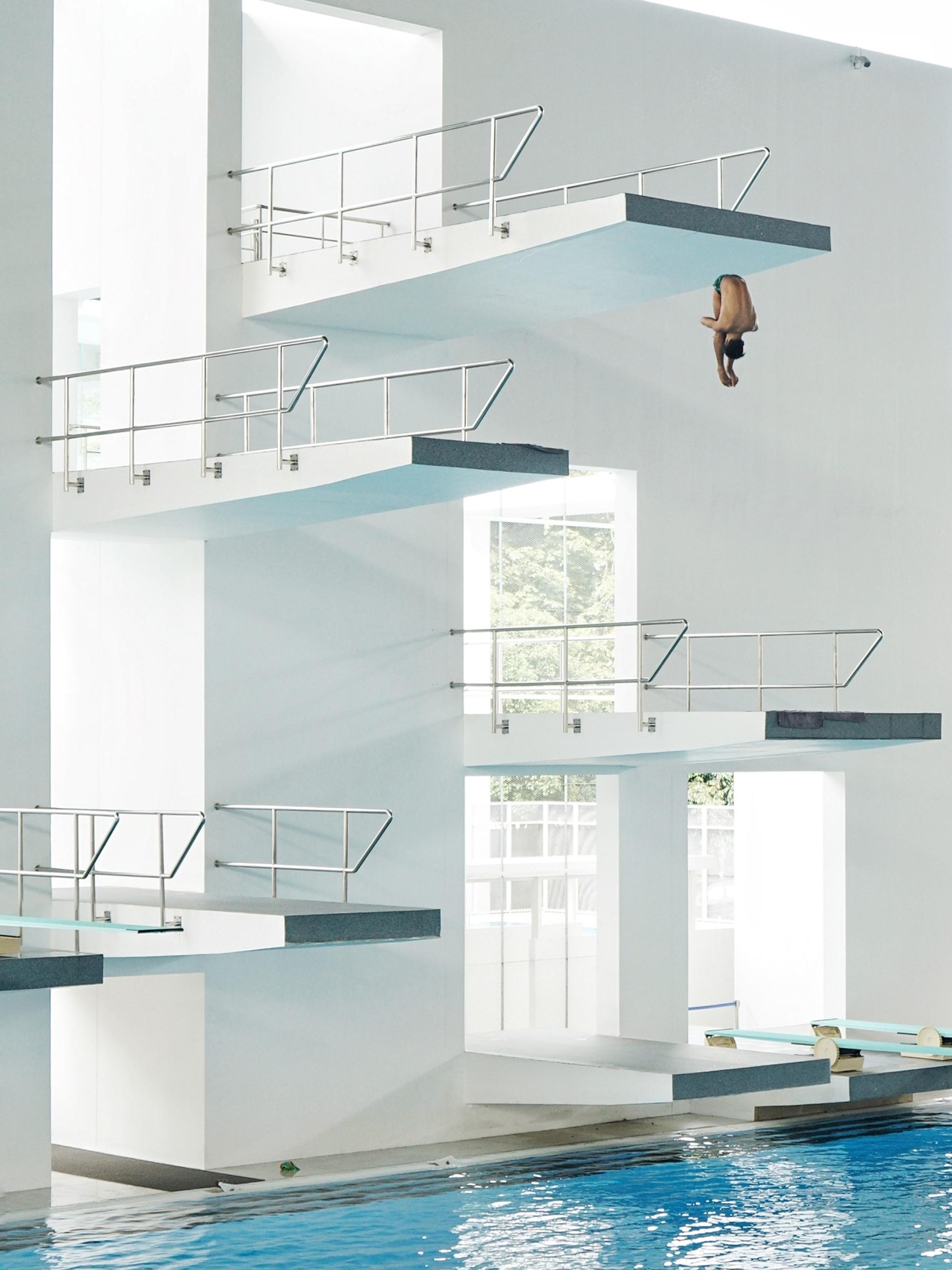 There was an event when I was wandering around the Aquatic Stadium, which had just opened to the public. Though the public could access the venue, they were restricted to only watch the swimming event, as opposed to the mass media representatives. The platform-jumping venue caught my eyes and I walked in to get an ideal distance to shoot from. I considered myself lucky to witness the platform jumping athletes in rehearsals.
