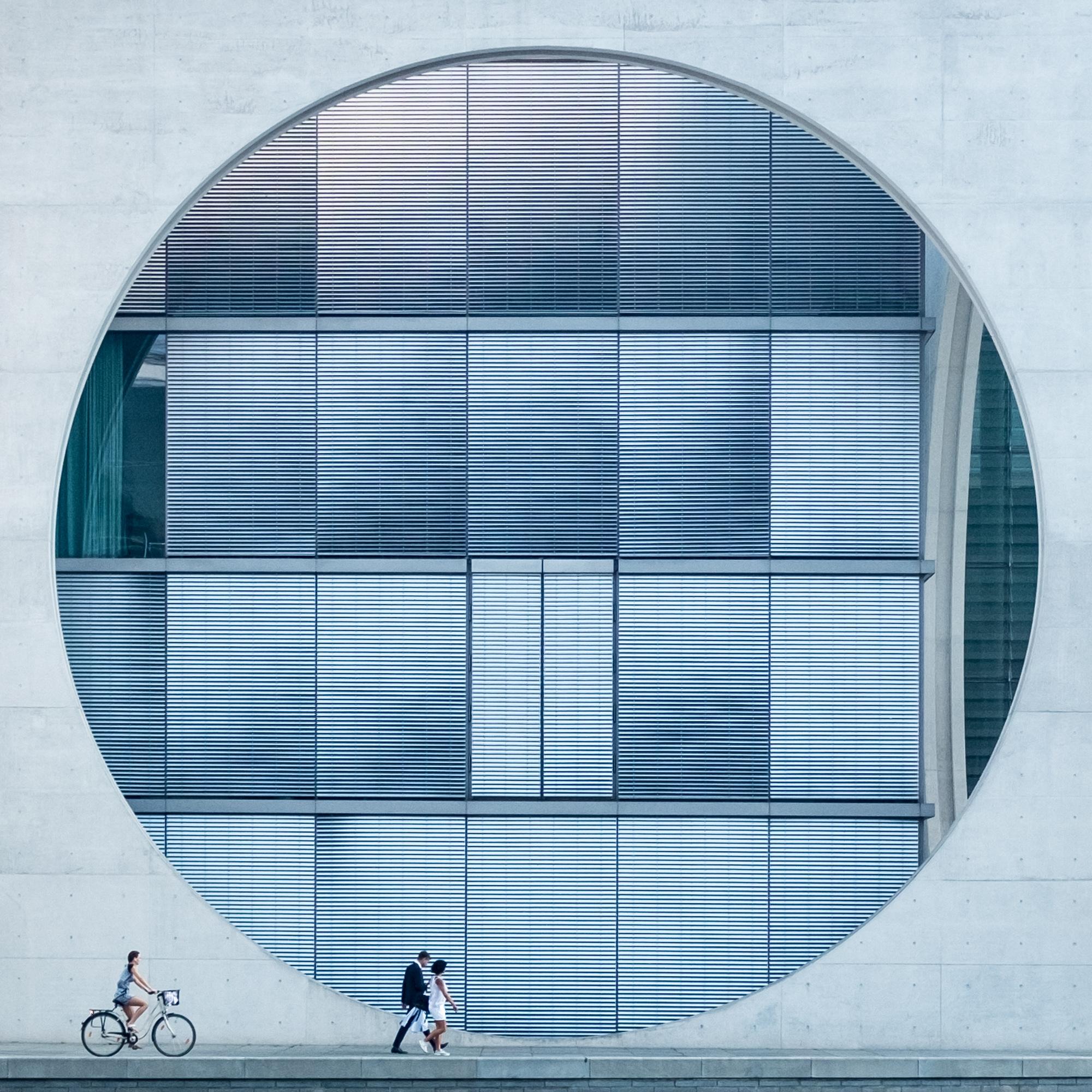 Having just arrived in Berlin on a bright summer's day, my wife and I decided to take a morning walk along the River Spree. We soon came across a large concrete building, and I was immediately struck by its geometry and scale. Across the river, I positioned myself for a single point perspective and waited for the right moment to capture it. A couple came into the viewfinder and I noticed the cyclist out of the corner of my eye. I waited for them to move into the frame and hit the shutter to try and balance the composition.