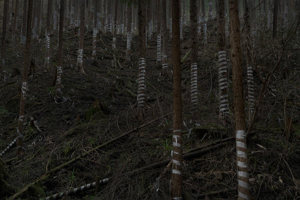 His new project, 'L'île aux libellules' (The Island of Dragonflies), which is shown on our blog for the first time, has all the hallmarks of Mauve's recurring themes: darkness, mystery, an inescapable alarm at our place in the world. The series takes us into a Jurassic Park-type world; a jungle environment where nature is reclaiming what is hers. Satellites immerge through the treetops, aging silver tape strangles a set of trees, electricity pylons disappear into the greenery. The images seem void of brightness, shot in subdued and sometimes difficult lighting conditions, often during dusk and dawn.