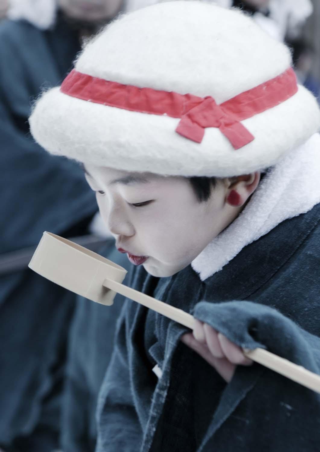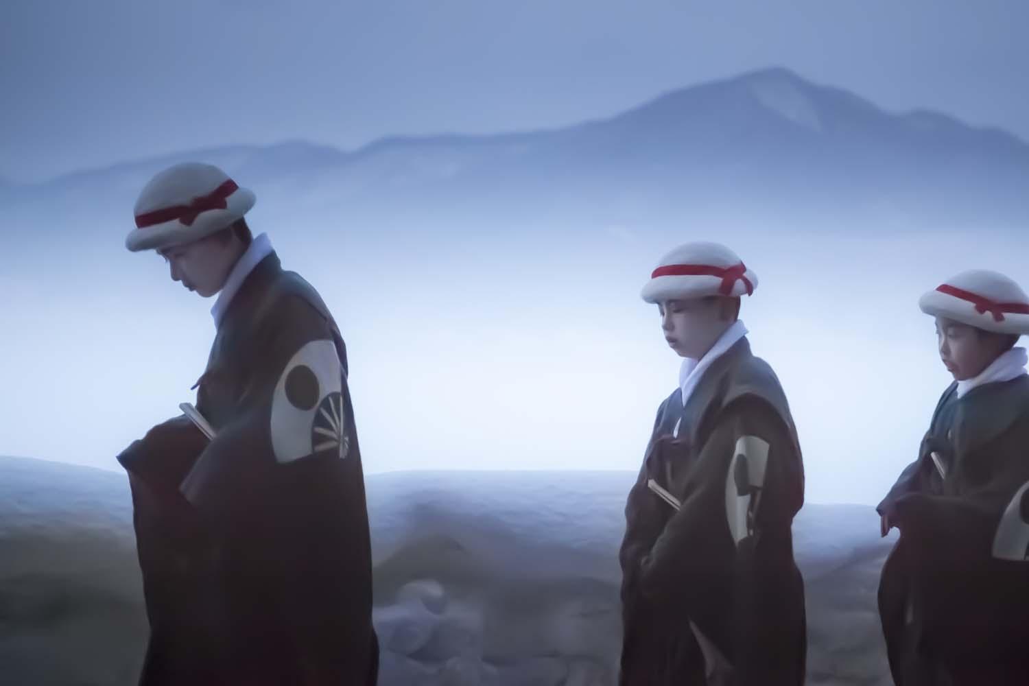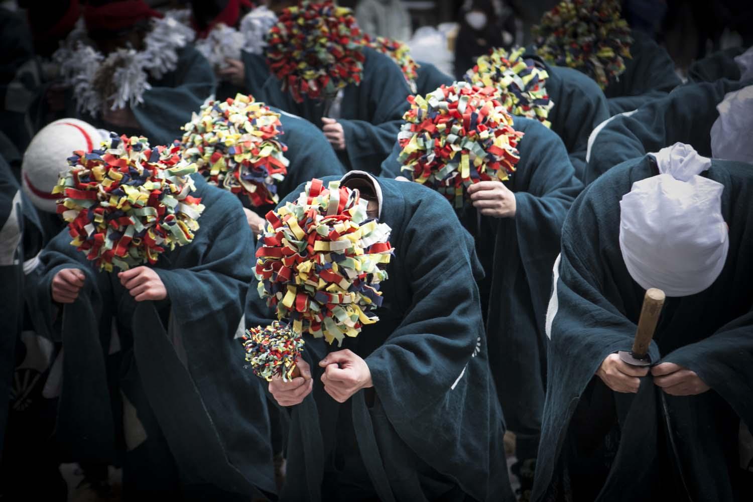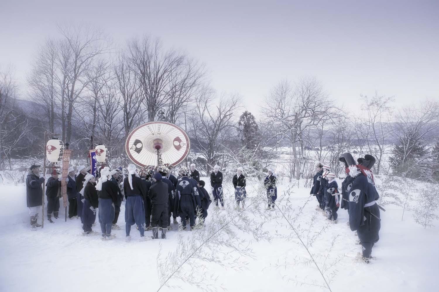 After my father’s sudden death, my own critical accident and the 2011 Tohoku earthquake and tsunami, I recall how my father came to me in a dream with the words: “Go to the village hidden deep in the snow where I lived a long time ago.” And so, with camera in hand, I set off on a restorative pilgrimage to northeast Japan (the first of numerous journeys). I arrived at the village, surreally silver in the snow and mist, and there discovered ZaidoAIDO, where inhabitants from different villages gather on the second day of each new year and conduct a ritual dance to induce good fortune.