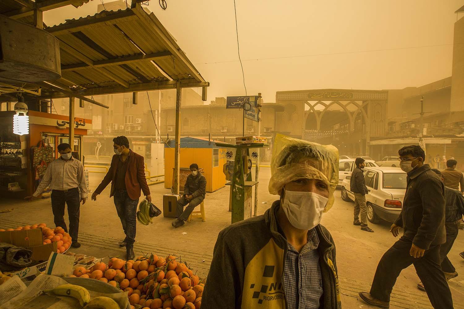 In these photos, I have tried to show the impact of climate change on everyday life and how people react in the event of this problem. To take these photos, I visited the crowded places of the city such as the bazaars and captured everyday life of people. Similarly, I captured other aspects of this problem, including a person who sold masks and selling masks as a way of earning his life in that situation; someone sleeping at the bus stop waiting for the bus, indicating the habituation of this issue for the residents; or a wage worker looking for work despite the dust storms; and finally, deserted entertainment venues. I also went onto the top of one of the tall buildings, showed the extent of the storm, and captured an overall view of the environmental disaster.