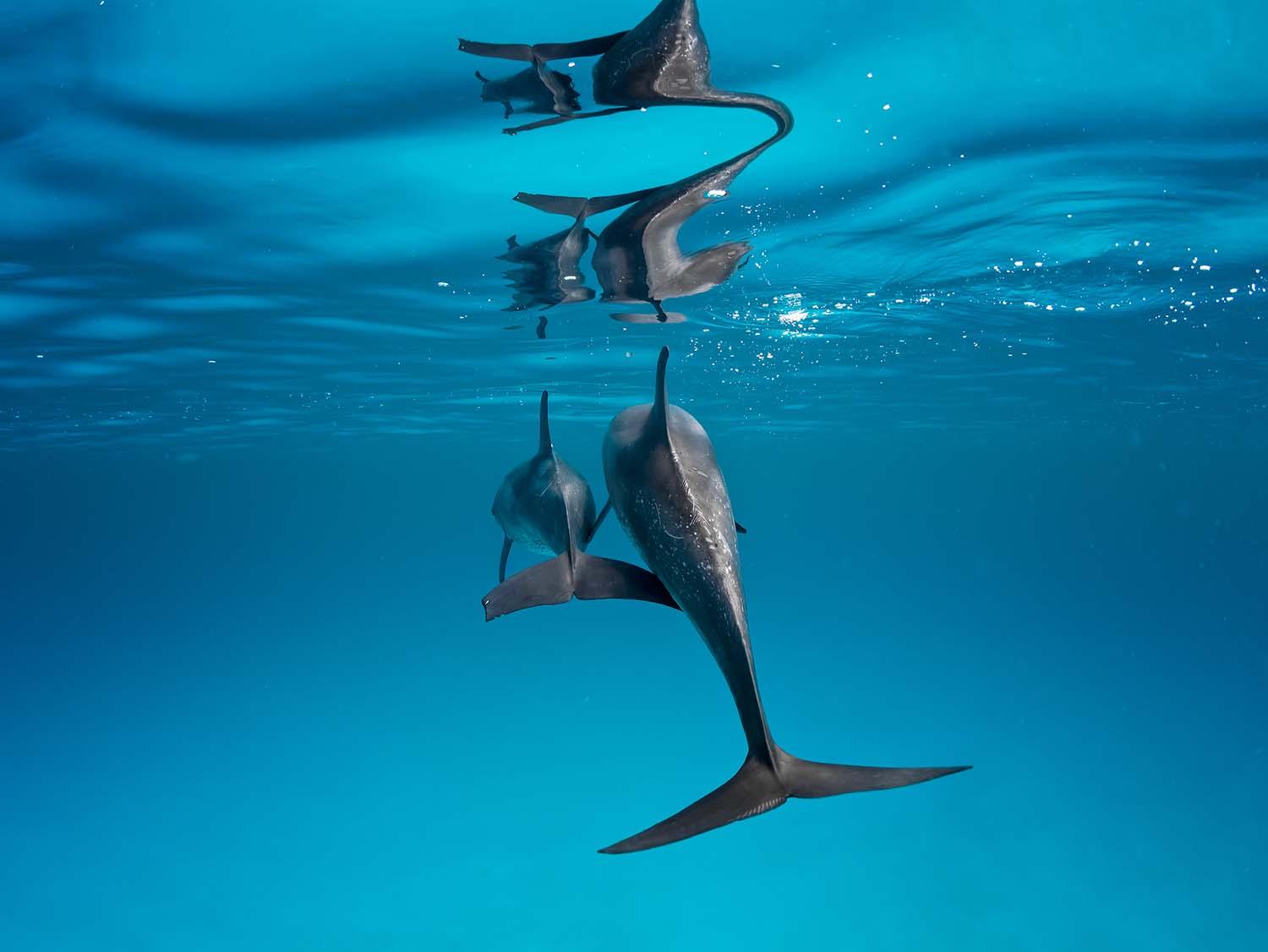 My photograph 'Serenity' was taken in Bimini, the Bahamas. Together with a small group of friends we went out for the day, hoping to find and photograph wild dolphins. After some searching, we came across a pod and entered the water. The dolphins seemed to enjoy the encounter, as they were playfully swimming around us. I saw a mother and her calf approaching me and as they swam by I took this photograph. It was a very peaceful moment and I thus titled the image accordingly.