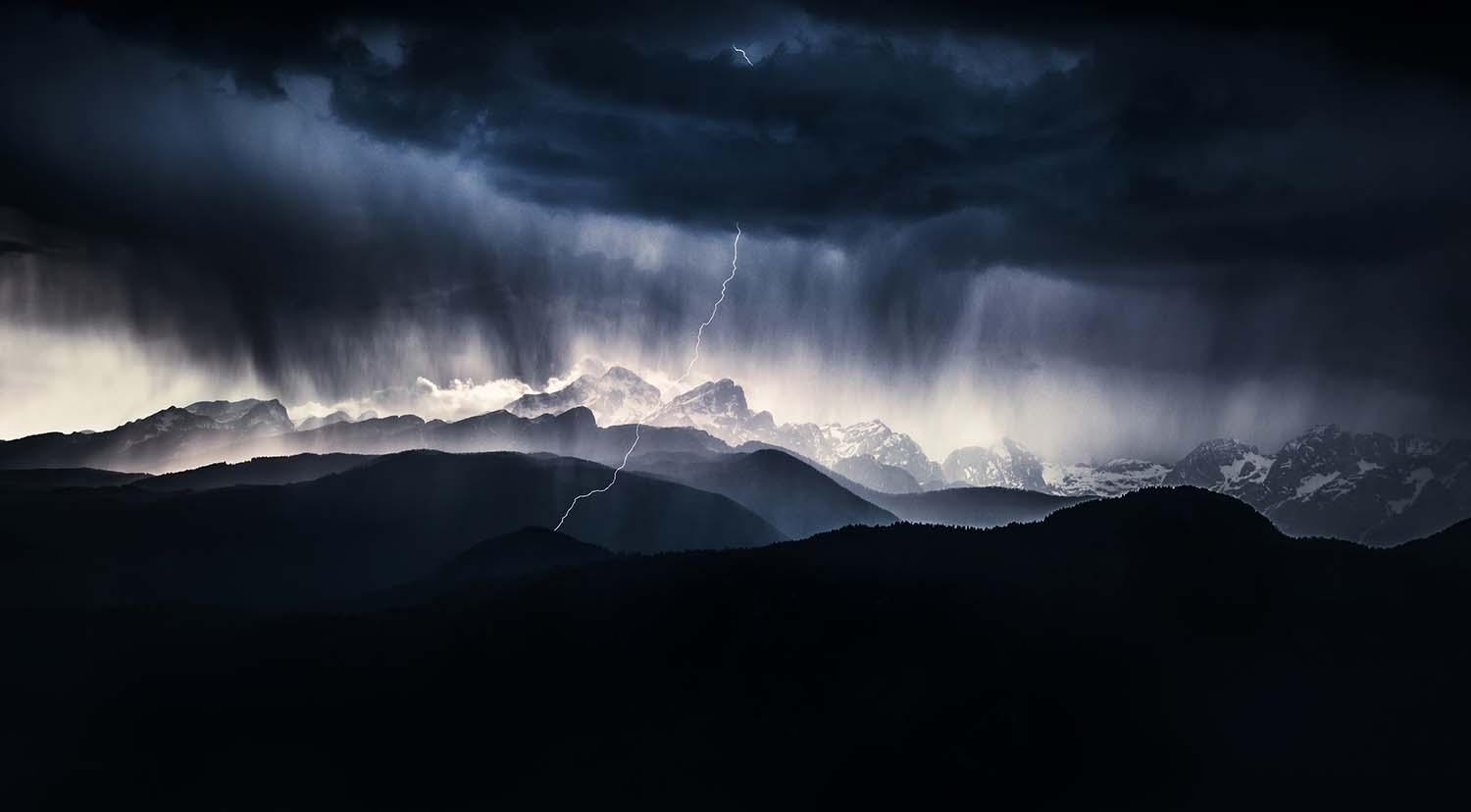 The image was taken from a local hill called Ajdna, which I often visit when I don't have time for longer trips to the Alps. It offers great views towards Julian Alps and Slovenia's highest mountain, Triglav. When I got to the top the storm was just passing above Mt. Triglav. I wanted to catch the lightning so I set up my camera on intervalometer (1 second intervals) and captured about 500 images this way. Luckily, on one of the photos, the lightning was captured perfectly. There was a lot of drama in the sky, that's why I went with a dark blue post processing to really emphasize all that was going on.