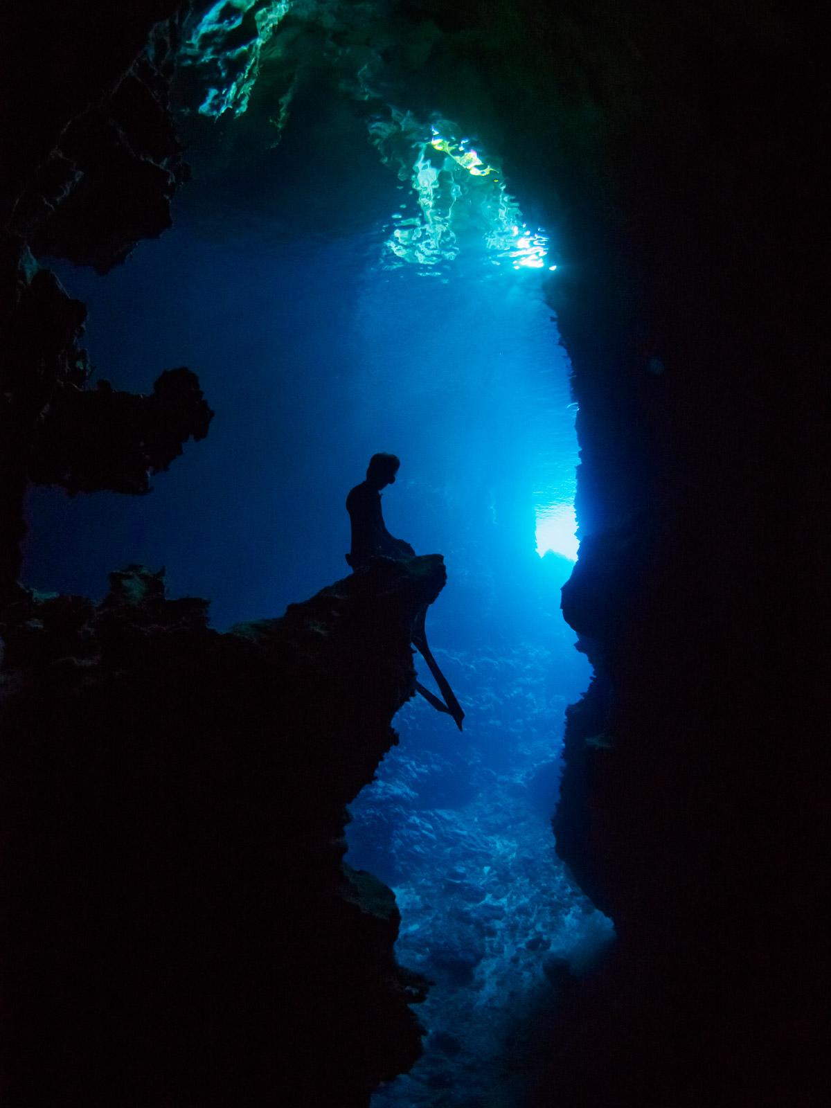 The series ‘Life in Blue’ was conceived when I visited an underwater cave in Tonga. We were freediving around the island before the whale swimming season began in July. The light in the cave created amazing light rays which have created a unique ambiance. I Have taken a few “Selfies” where I have placed the underwater housing on a rock pinnacle at 10m, set the timer to 10 seconds and after clicking the shutter - swam to position myself for the shot. The resulting photos were very interesting so I have decided to explore the possibilities. 3 months later, during the whale swim season in Ha’apai, I took three of my fellow freedivers back to the cave to attempt a few more scenarios.