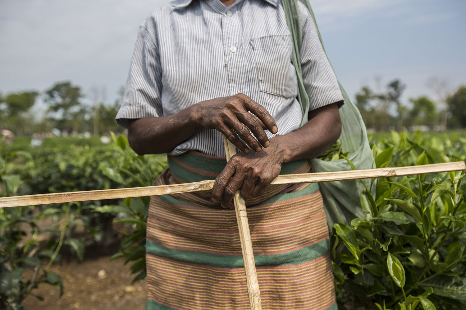 © Matilde Gattoni - India, West Bengal: A tea plucker's hands at Mogulkata Tea Estate, in the Dooars region. Every plucker is given two cross-shaped wooden sticks to measure the height of the tea bushes. Only the leaves higher than the horizontal stick can be plucked.