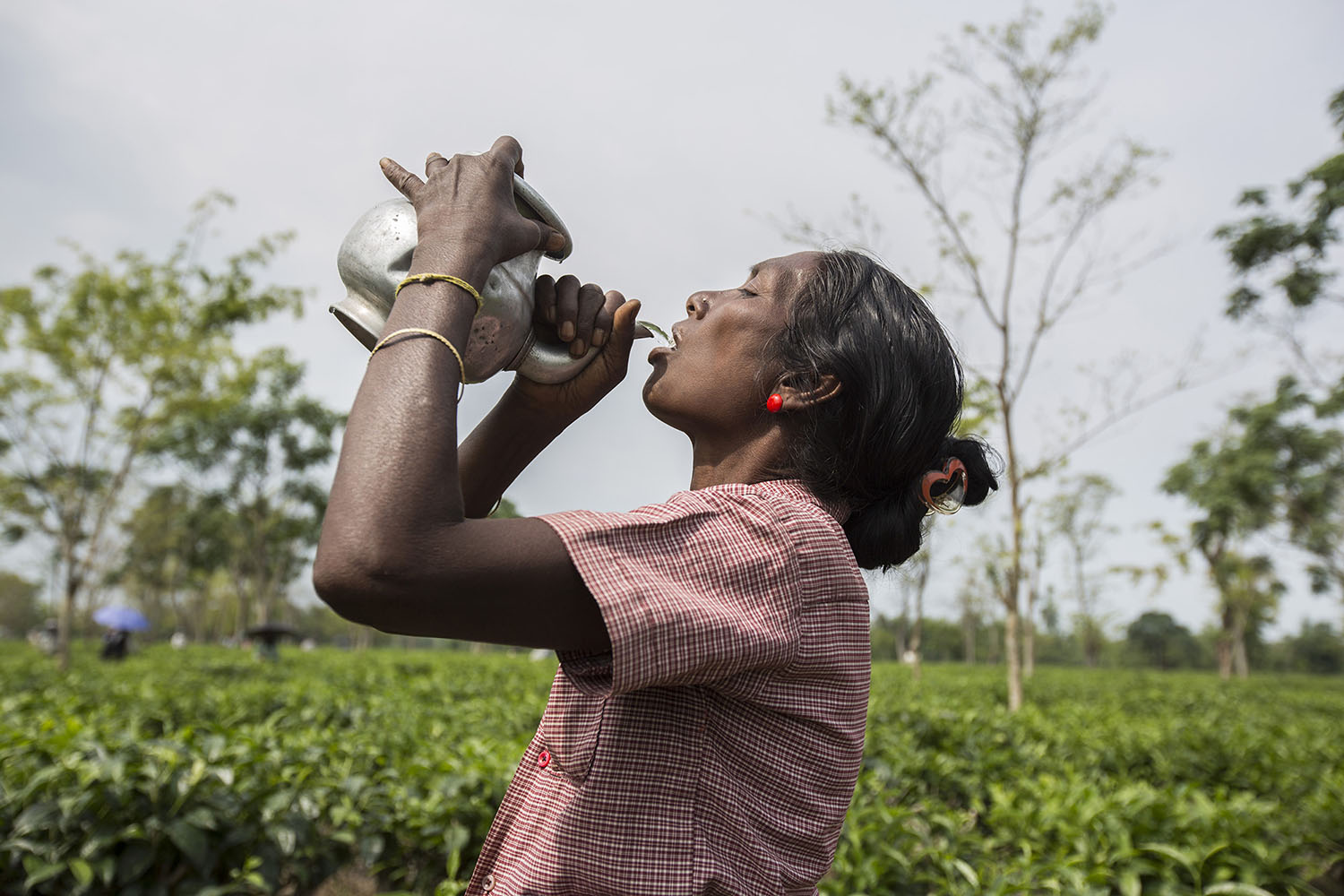 © Matilde Gattoni - India, West Bengal: A tea plucker drinking during a work pause at Mogulkata Tea Estate, in the Dooars region. Safe drinking water, which should be provided by the companies, is one of the most common problems in the tea estates. As a result of its poor quality, fever, diarrhoea and abdominal pains are widespread among the workers.