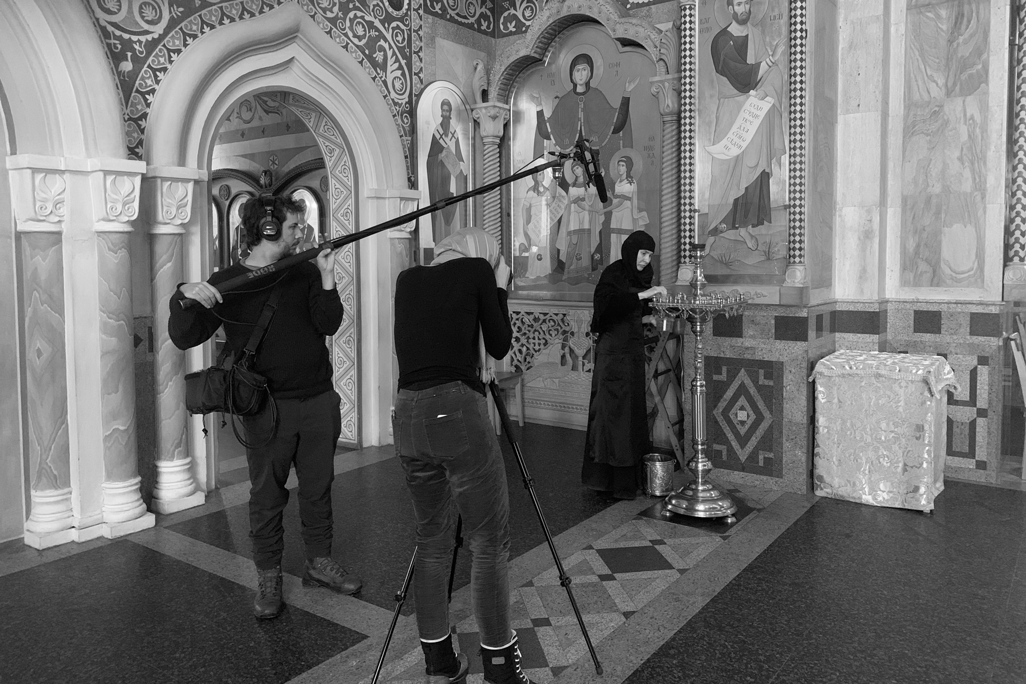 Most of the film is shot from an observational viewpoint as events unfolded around us. We spent many weeks in the convent in Belarus, so began to understand the routines and rituals of monastery life. A couple of scenes were re-shot (for instance the opening cloak scene) but it isn‘t a conventional documentary with interviews to camera. Sometimes, it feels like you are watching a piece of fiction with the dramatic landscapes and elaborate group scenes. Vera’s narration forms the backbone of the story, but with most of the dialogue and talking (such as the big meeting with the men in rehabilitation) we were documenting issues being discussed anyway, regardless of our presence. We would occasionally encourage a conversation, but the majority of what you hear and see is unprompted and un-scripted. We worked with ideas and themes, but did not have a written script.