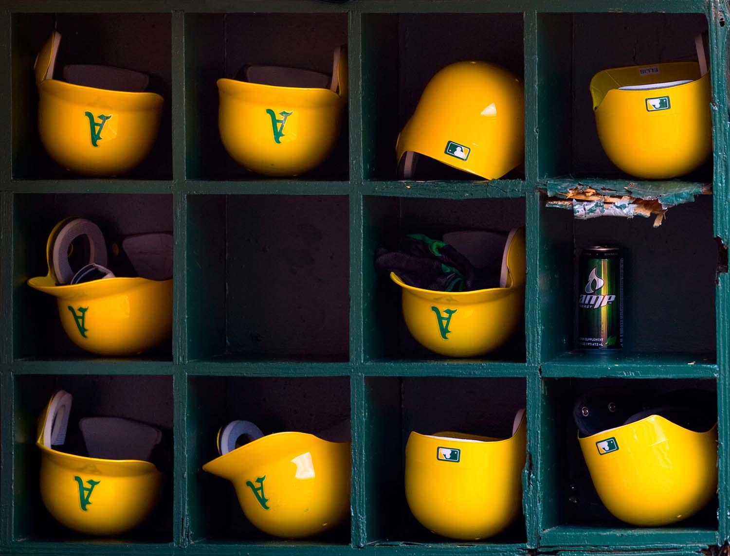 There are many moments of downtime when you shoot a baseball game, so there are always opportunities to look into the dugouts before and during games for candid portraits of players. I used to get some really nice stuff during batting practice before games, but nowadays all of the parks have nice indoor batting cages and teams don’t take BP (batting practice) out on the field anymore - especially before day games. This is a huge bummer as BP is always a great time to get the players when they are loose, goofing around, and laughing with their teammates. Also, some guys simply have better faces and are more photogenic than others. These are the ballplayers you like to focus on when they come to town. Many teams only visit your area once a season, so it is important to take advantage of these rare opportunities. There is nothing like looking into the eyes of a subject in a photograph. They draw you in and really make you look. In recent years I have turned much of my attention to shooting wide angle candids of guys goofing around in the dugout right before game time. The Oakland Coliseum where the A’s (Oakland Athletic team) play is the only park in baseball with no fence in front of the dugout, so I can sit on the dugout steps before the game, talk to the players, and get some really fun stuff. Often the best pictures I get are before a game.