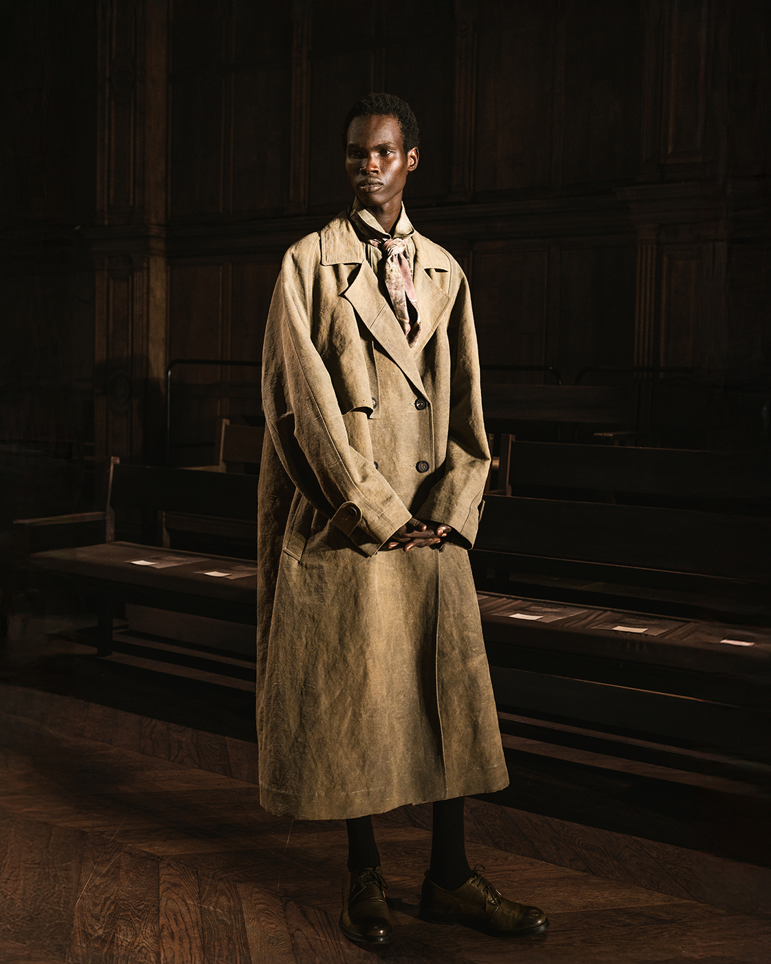 This portrait, taken shortly before a fashion show in Paris, France, captures a model in a serene moment of solitude. Standing in a dark, wood-panelled room, his vintage trench coat and refined neck scarf exude timeless elegance.