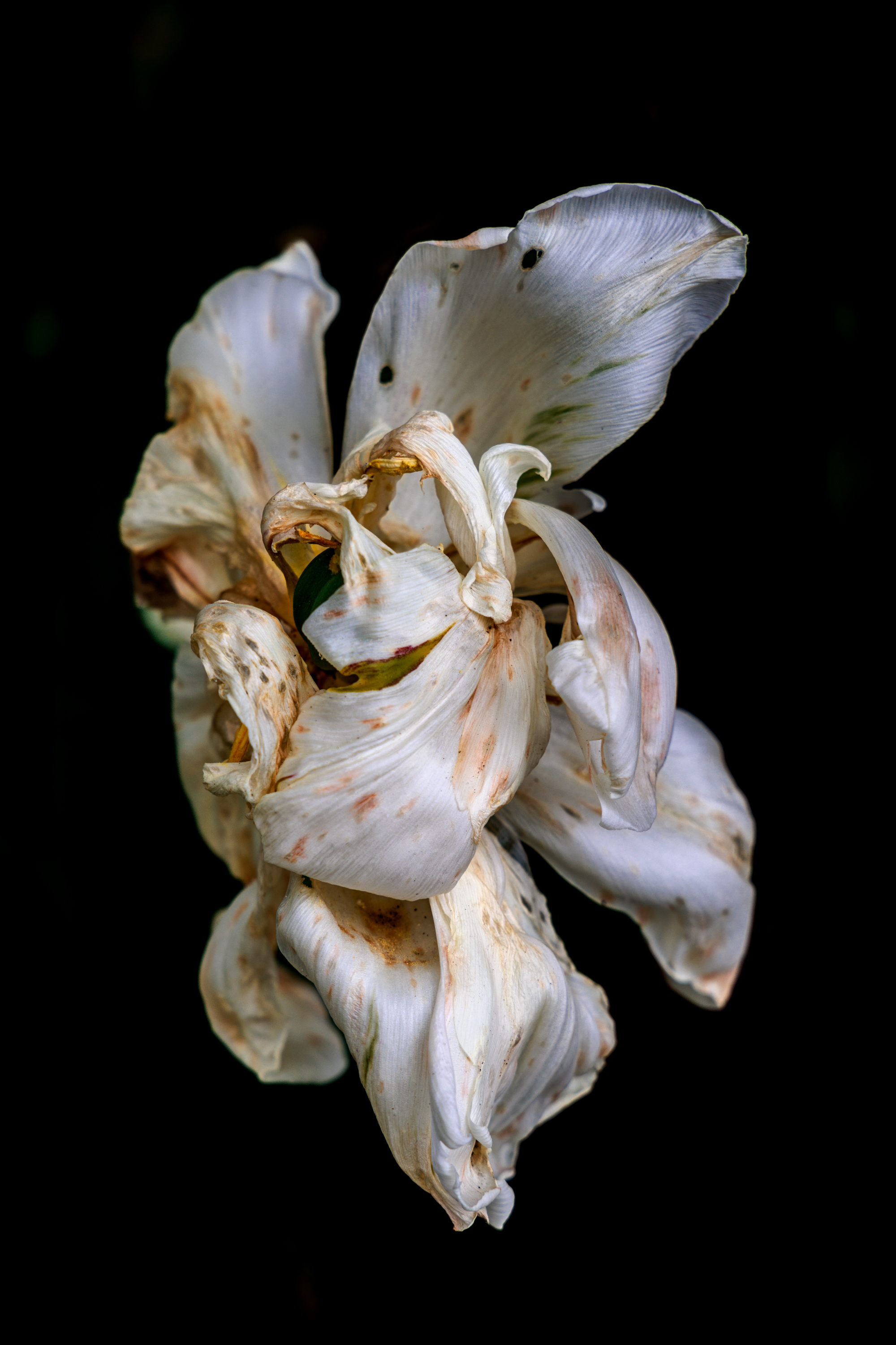 This dying tulip was much more interesting to the photographer than a pristine flower in full bloom, thanks to the colours that it had accrued, the twists, turns and textures of the petals, and its multi-directional asymmetry.