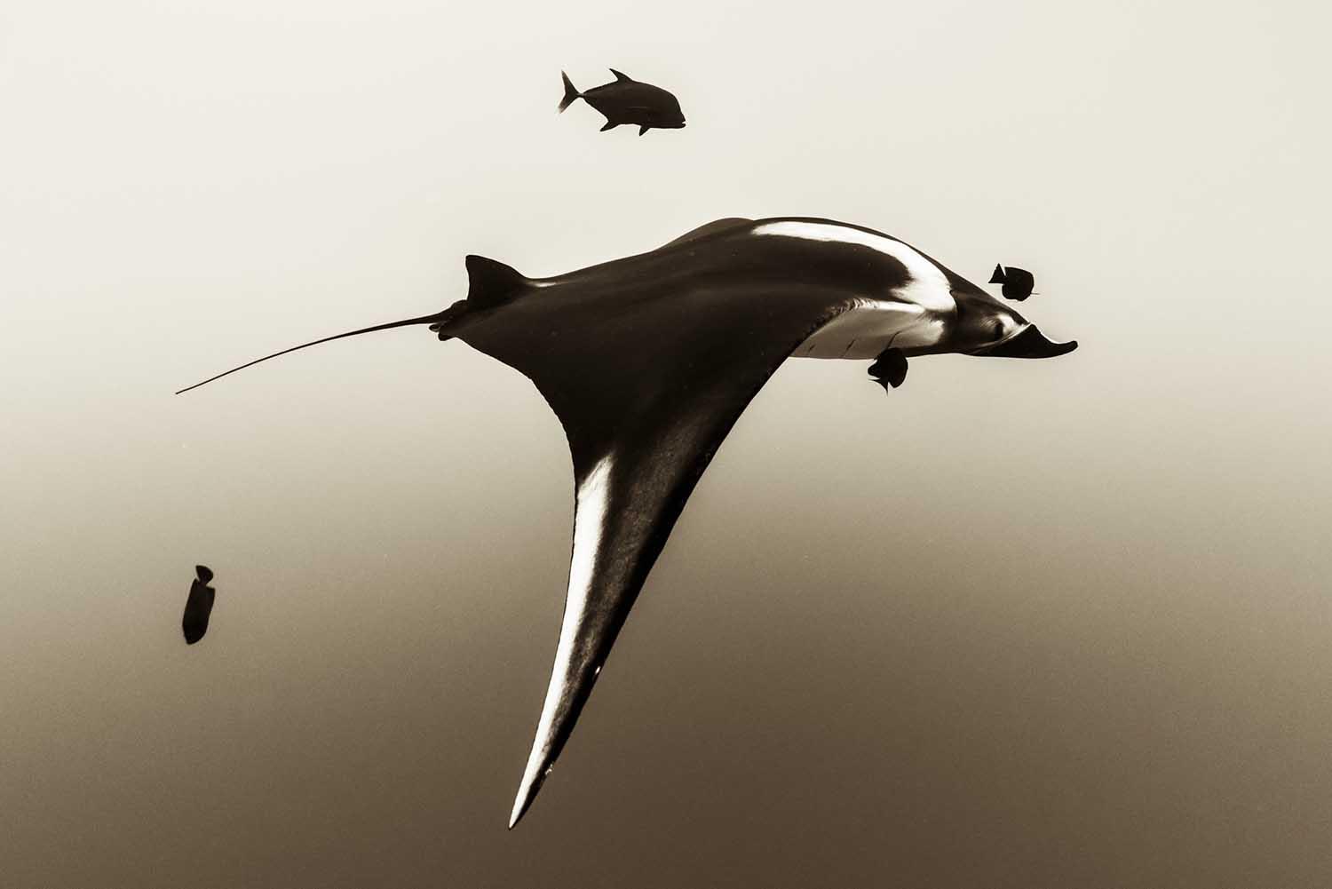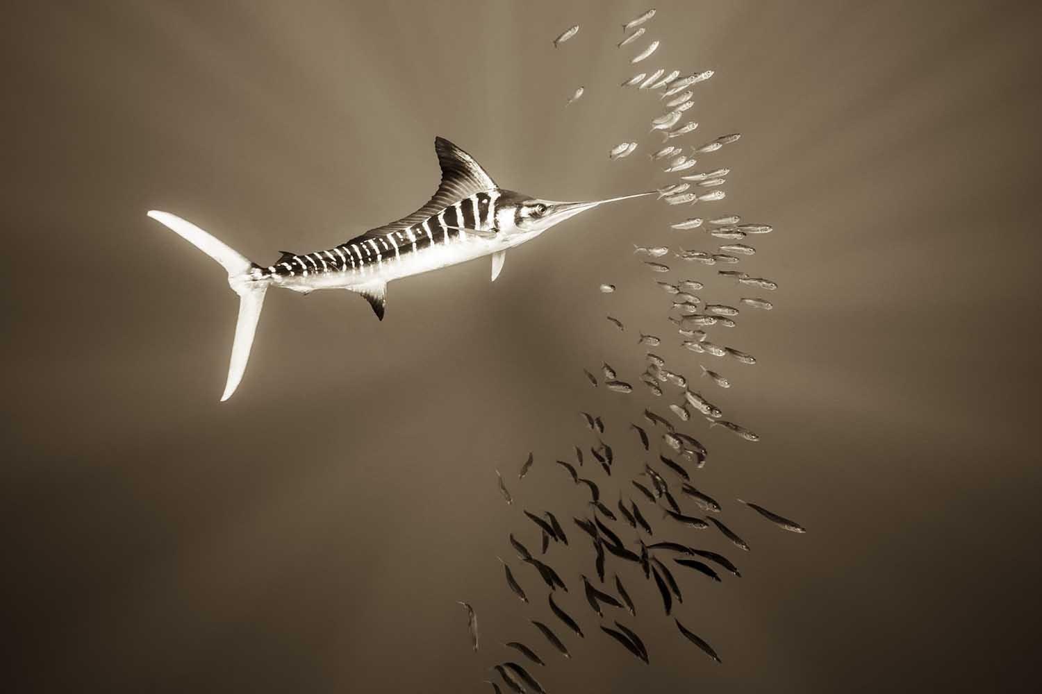 Underwater photography usually takes a lot of planning and logistics, especially to find specific animals. To take these images I first needed to travel to the area where they live, which is often in remote areas. I have to carry all the camera equipment, including an underwater housing and all my diving gear. For the shark image I wanted to be in the water at sunset, which create magic sunrays in the water but that usually takes some additional planning with the dive operator. The Striped Marlin is feeding in a very remote area from Baja California as well as very far away from the shore (some 60 miles), so I needed to contact a local fisherman that was willing to take me that far out. One of the best chances to encounter a Silky shark or a Giant Manta are in the Mexican Revillagigedo Islands, which are only accessible with a Liveaboard that takes at least 30 hours of navigation from the nearest port, and these trips are only available during a few months every year.
