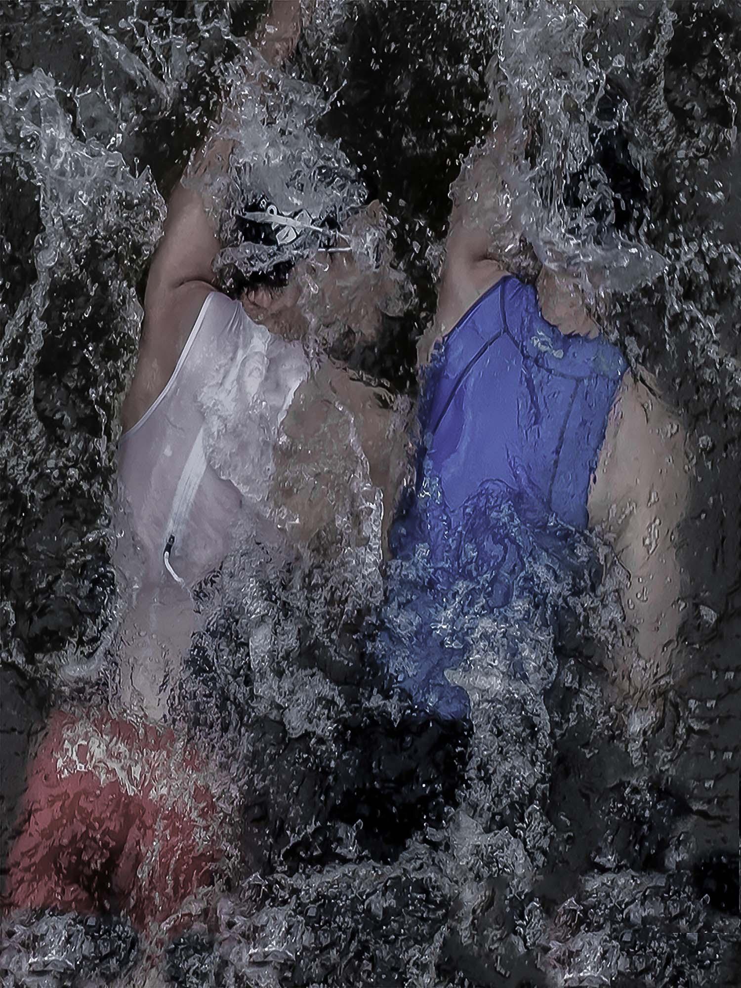 This picture was taken in summer of 2017 from 35 individual images of swimmers at the triathlon in the Duesseldorf Media Harbor. I was able to take a picture of them from above, while the athletes crossed a pedestrian bridge capturing their very individual "breathing techniques“. I was inspired by the work of Andreas Gursky, therefore I took the individual images with the highest possible sharpness. That enables me to display or print the overall picture in large format.