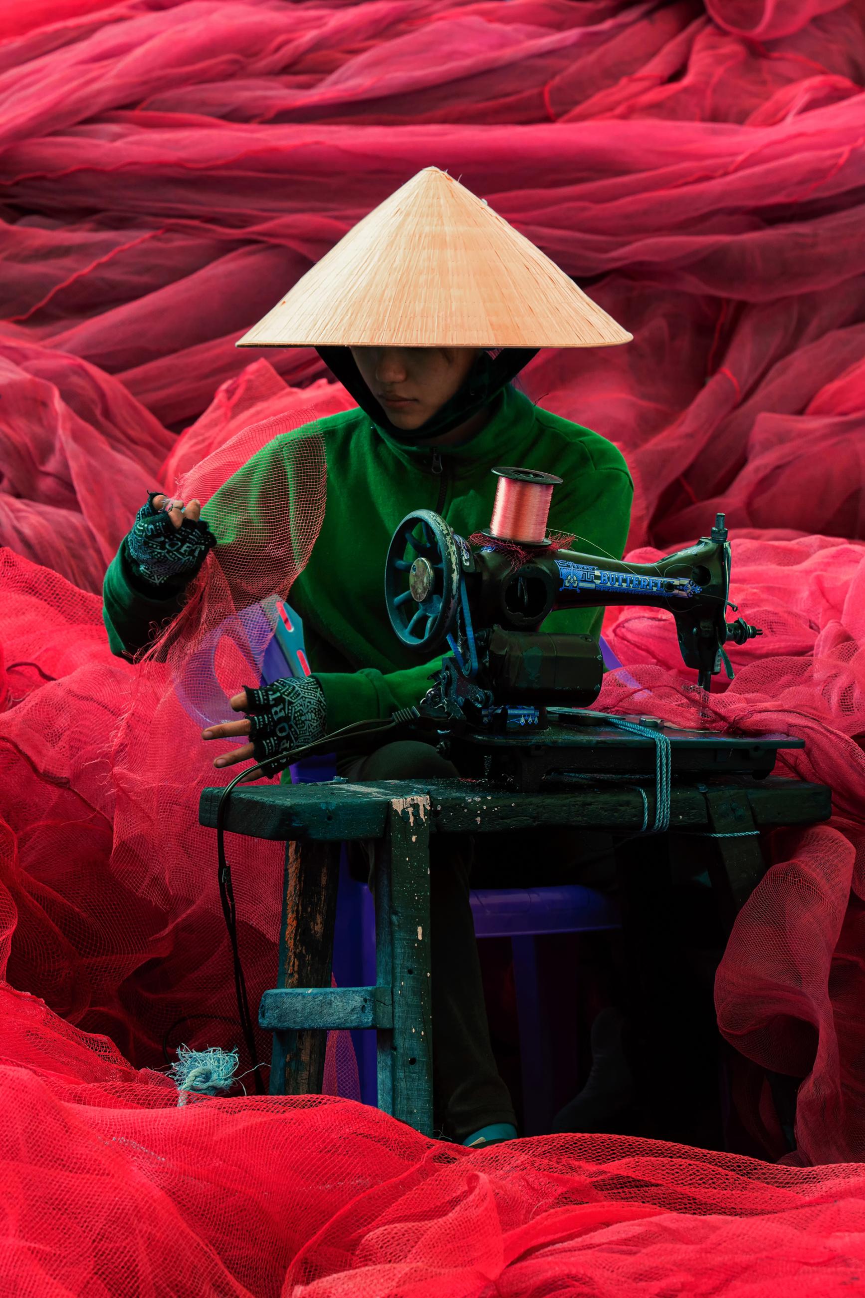 After every sea trip, fishing nets are often torn, so this is a daily job in the waters of Ninh Thuan, Vietnam. This staged shots highlights the traditions of the region.