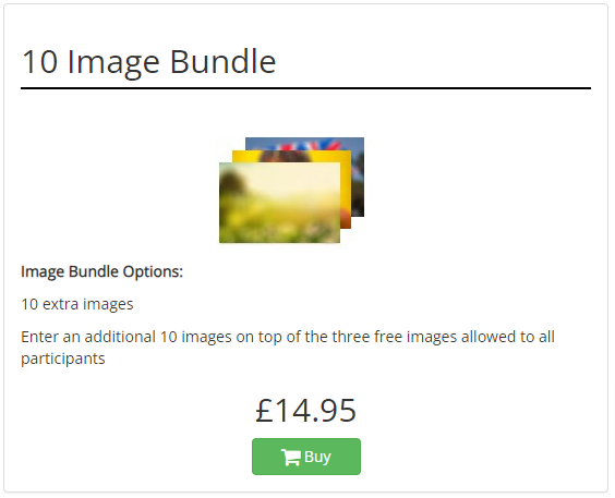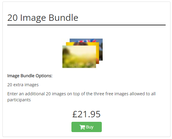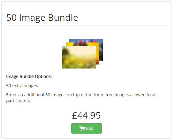 Available in three different packages, Image Bundles boost the image allowance in your account. For example, if you buy the 50 Image Bundle, you will be able to enter 50 images (that's not including the three FREE images you can automatically enter every year).