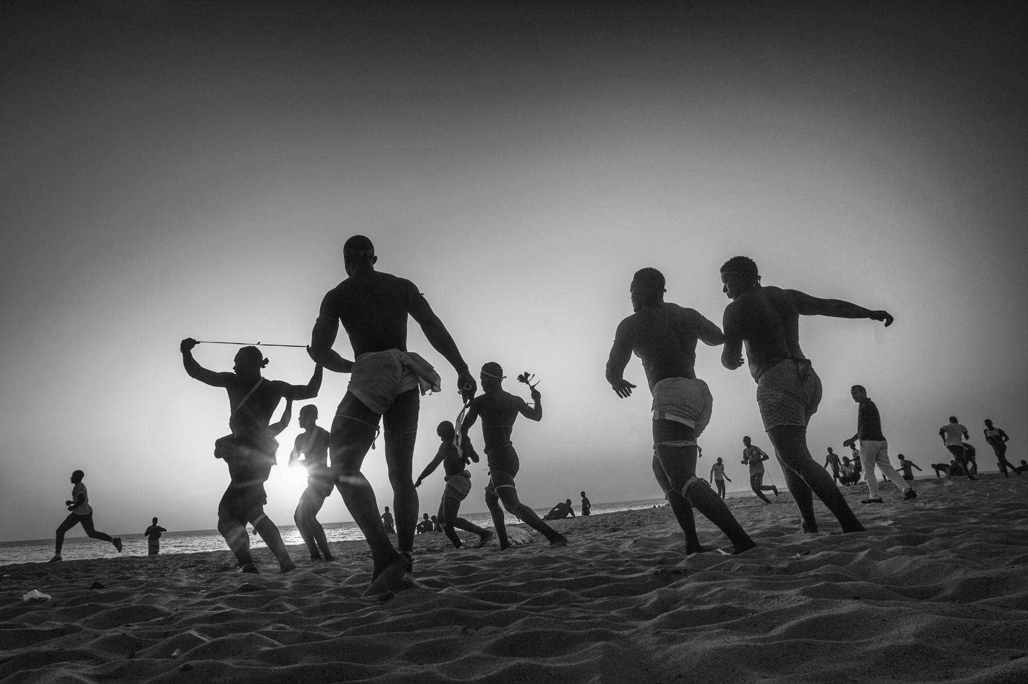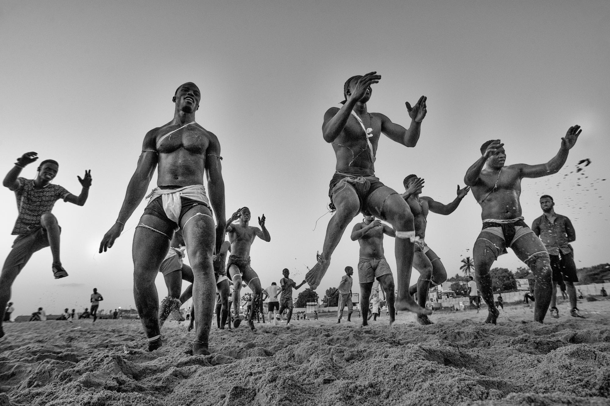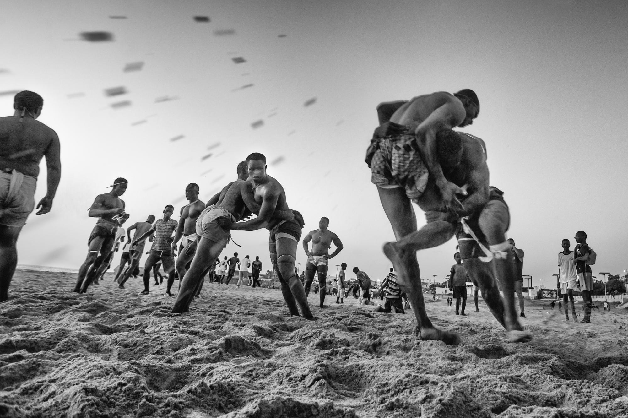 "Wrestling has become the number one national sport in Senegal and parts of The Gambia. It belongs to a larger West African form of traditional wrestling (known as Lutte Traditionnelle) and is more popular than football. Senegalese wrestlers practice two forms of the sport: Lutte Traditionnelle avec frappe and Lutte Traditionnelle sans frappe (international version). The sport has become a means of social ascendance, making some athletes millionaires. Fights have been known to attract audiences of around 50,000 in a stadium. For many, it’s a slice of African life, tradition and culture, in which there is a mix of animist and Muslim beliefs. These pictures show wrestlers training on a beach in Dakar."