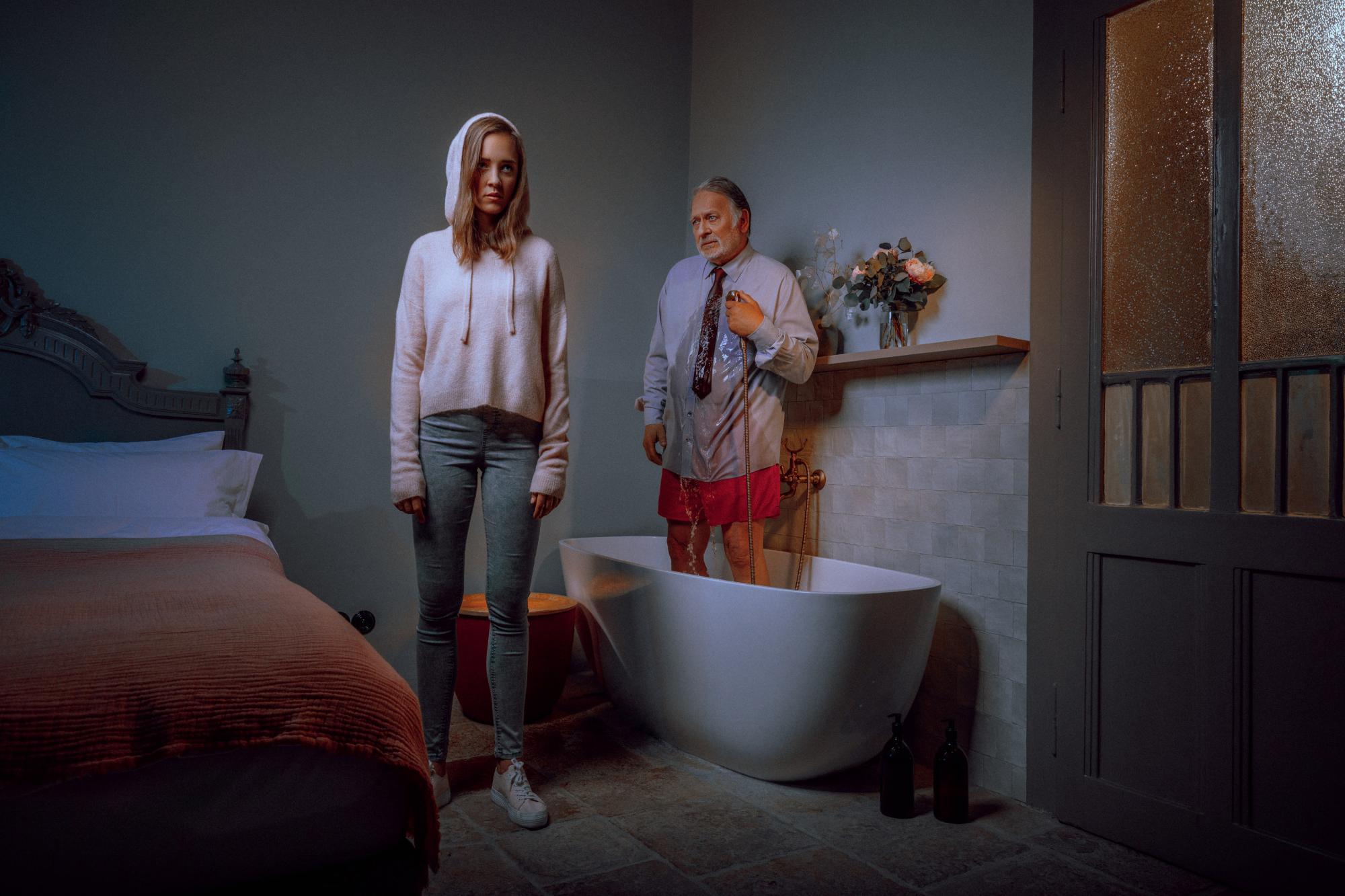 "Eight Rooms is a series of eight scenes - portraits - where people are captured in disturbing situations. The series was created in 2019. My photography always reflects a contradiction between order and disorder, both in the physical world and a state of mind. Here I had the pleasure of working with actors from the Svanda Theater in Prague. Their acting skills went beyond the gestures of ordinary models, which gave me the opportunity to capture variations of possible stories hidden behind a simple look or move of the lip. The final explanation is left up to the viewer - for me, this is preferable to presenting a final story without any space for imagination."