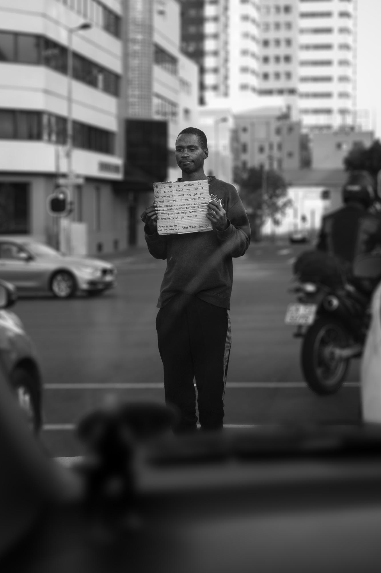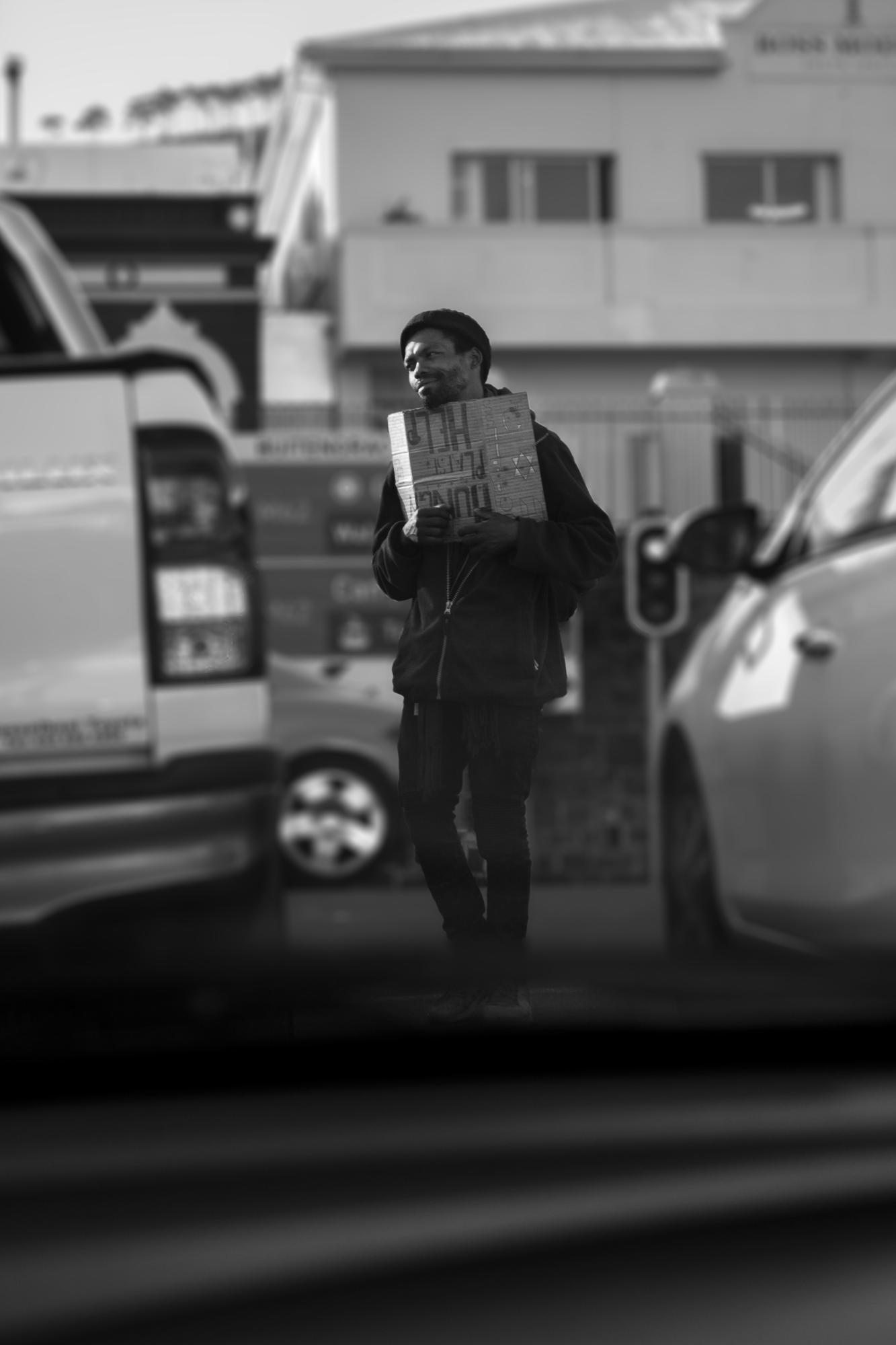 Every day while sitting in one’s vehicle at Cape Town’s traffic lights, one experiences the lines between poverty and privilege. I tried to capture these invisible lines. This series of images are taken from the point of view of the car passenger looking through the window. The window acts as a barrier between the exposed and the protected. Look closely at the scene, and the invisible lines start to become visible.