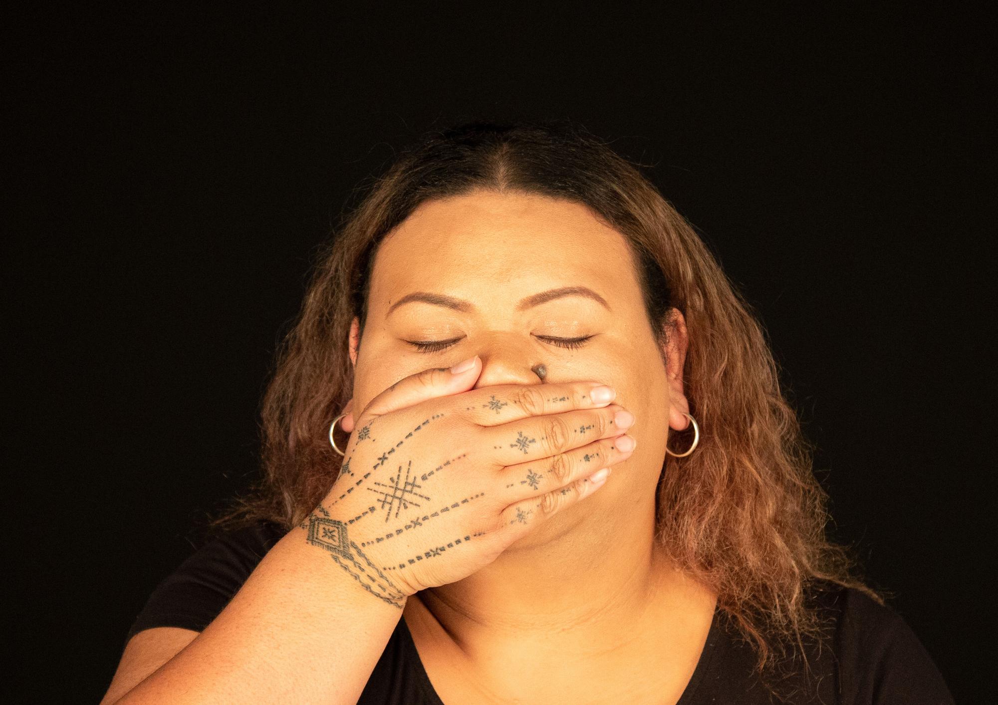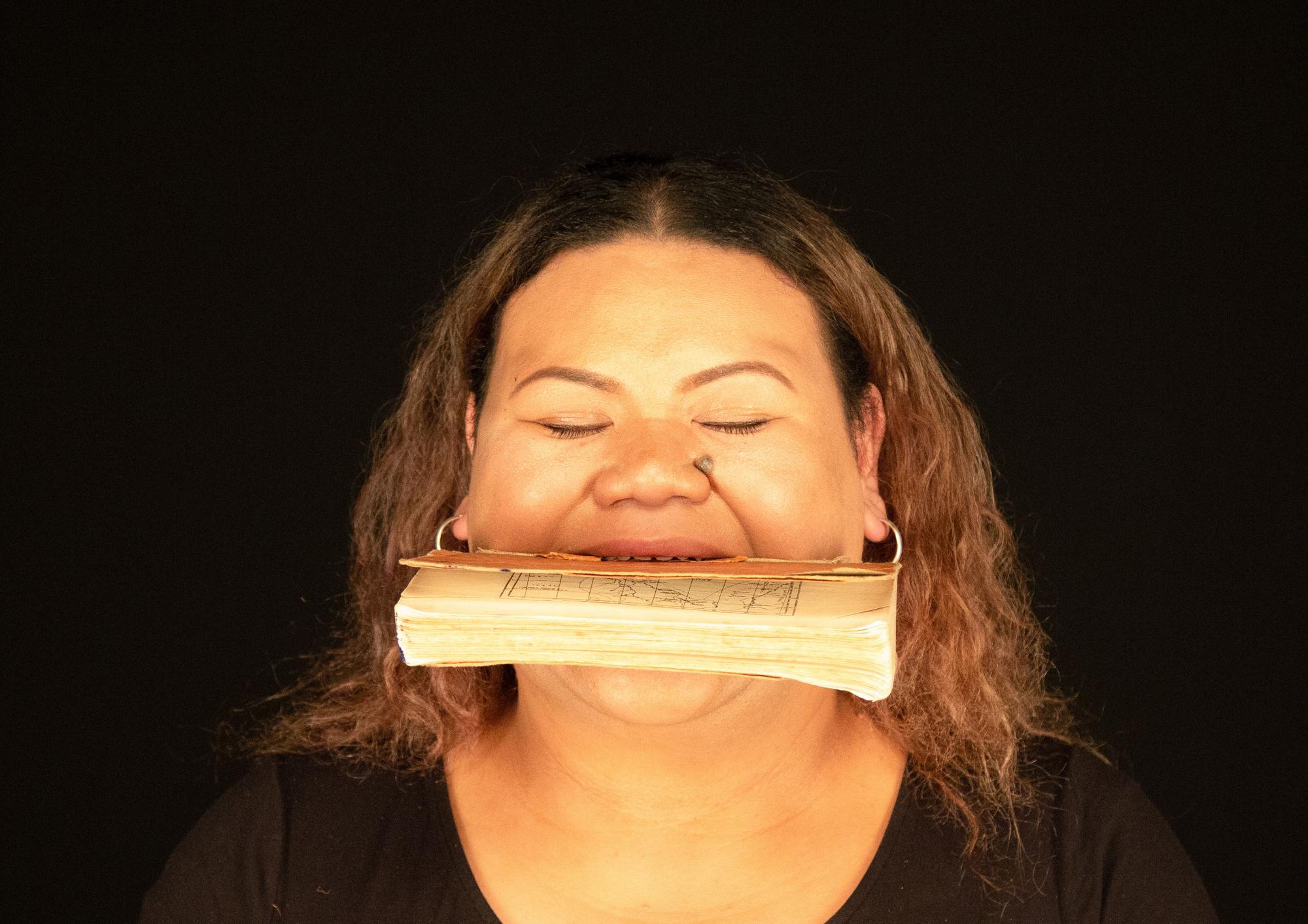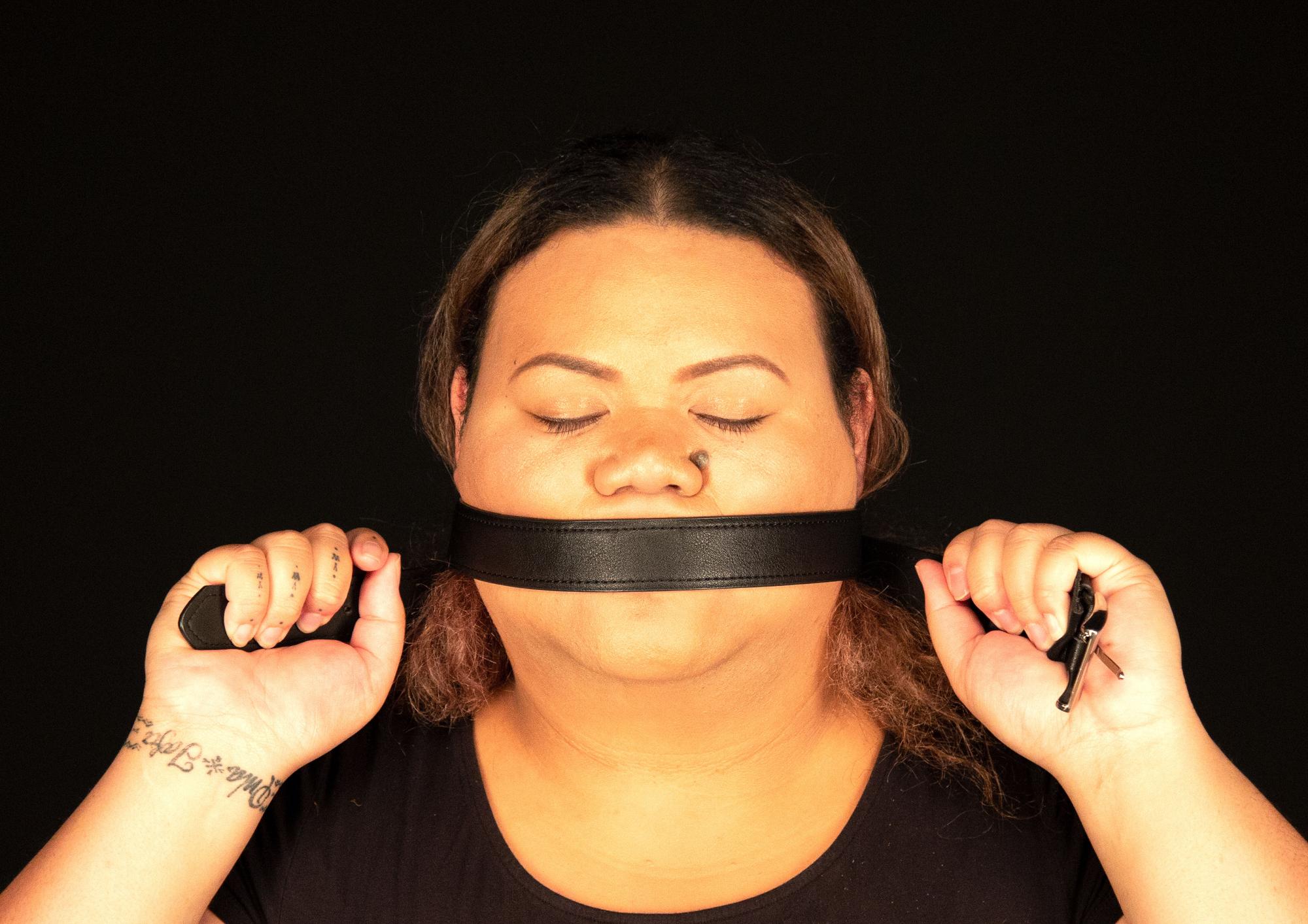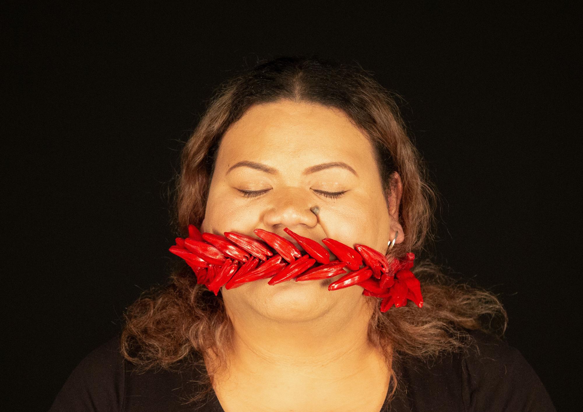 the migrants' dream - where the hopes and dreams of my family played an influential role in how I was raised. Through my experiences, the artwork has become an outlet for my frustrations. This series of photographs shows me biting or having my mouth covered by different objects. My clasped jaw and gritted teeth are a metaphor for being silenced. This act creates an uncomfortable pressure around my head, showing my inability to voice my opinions.