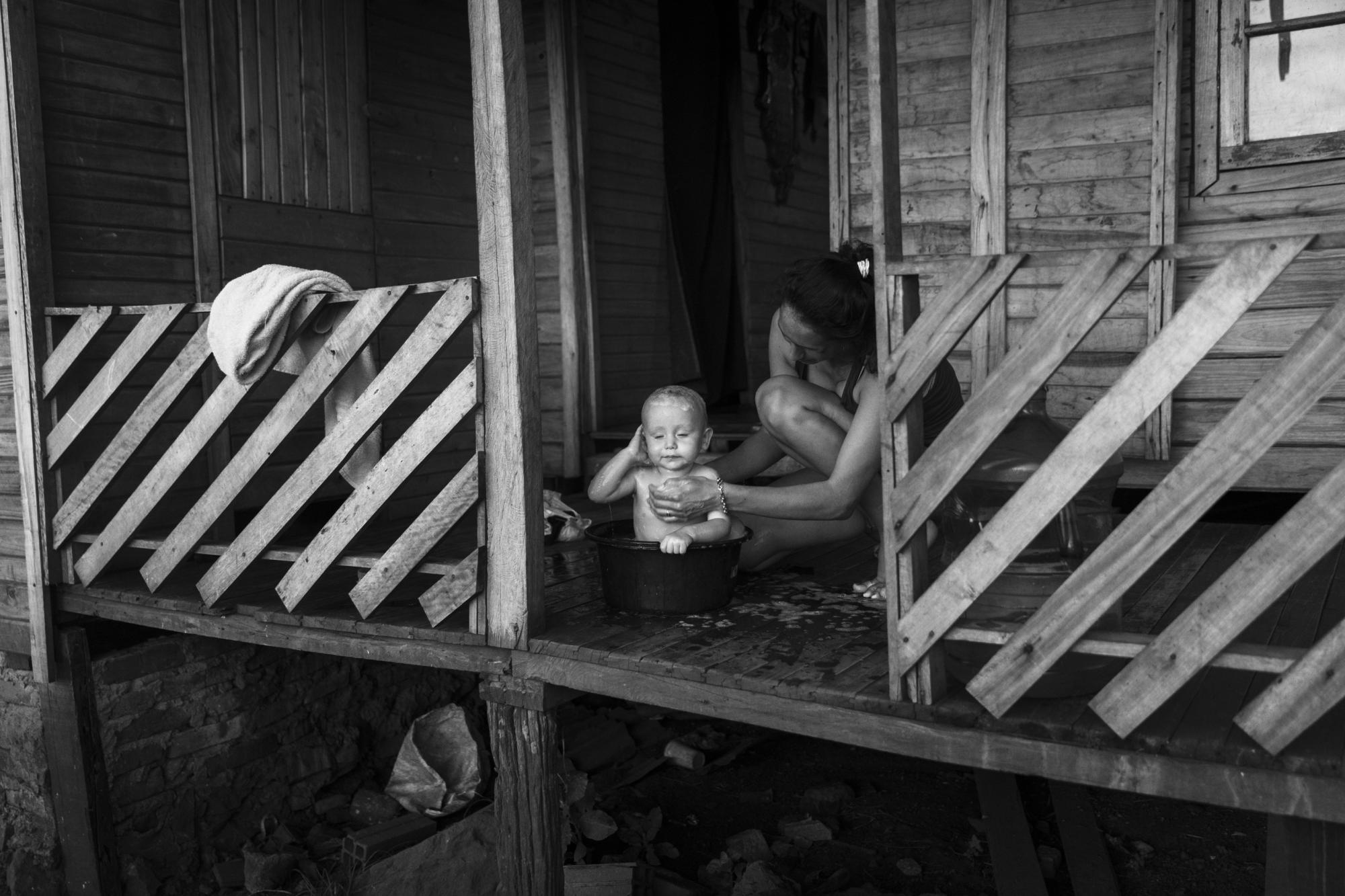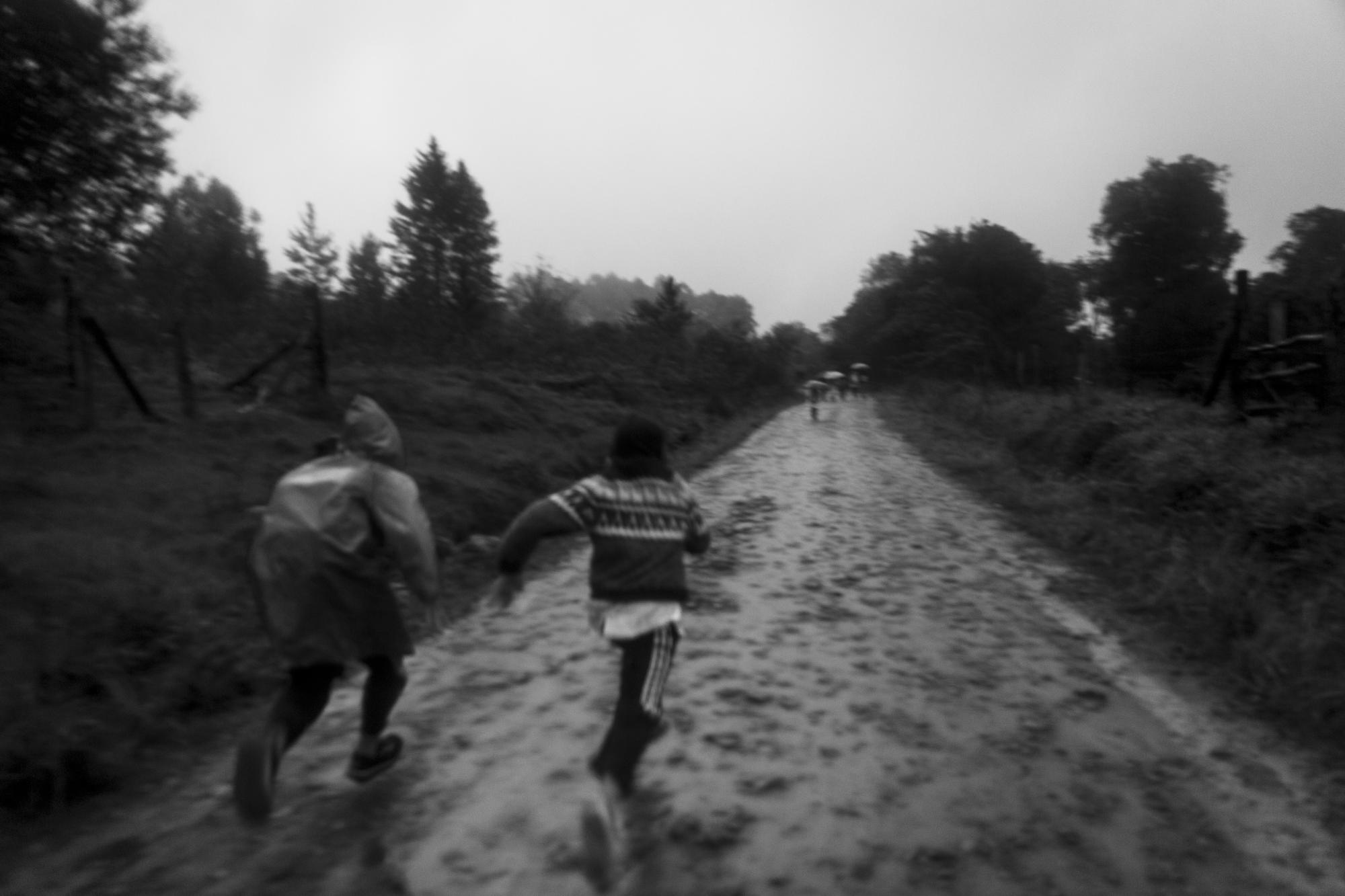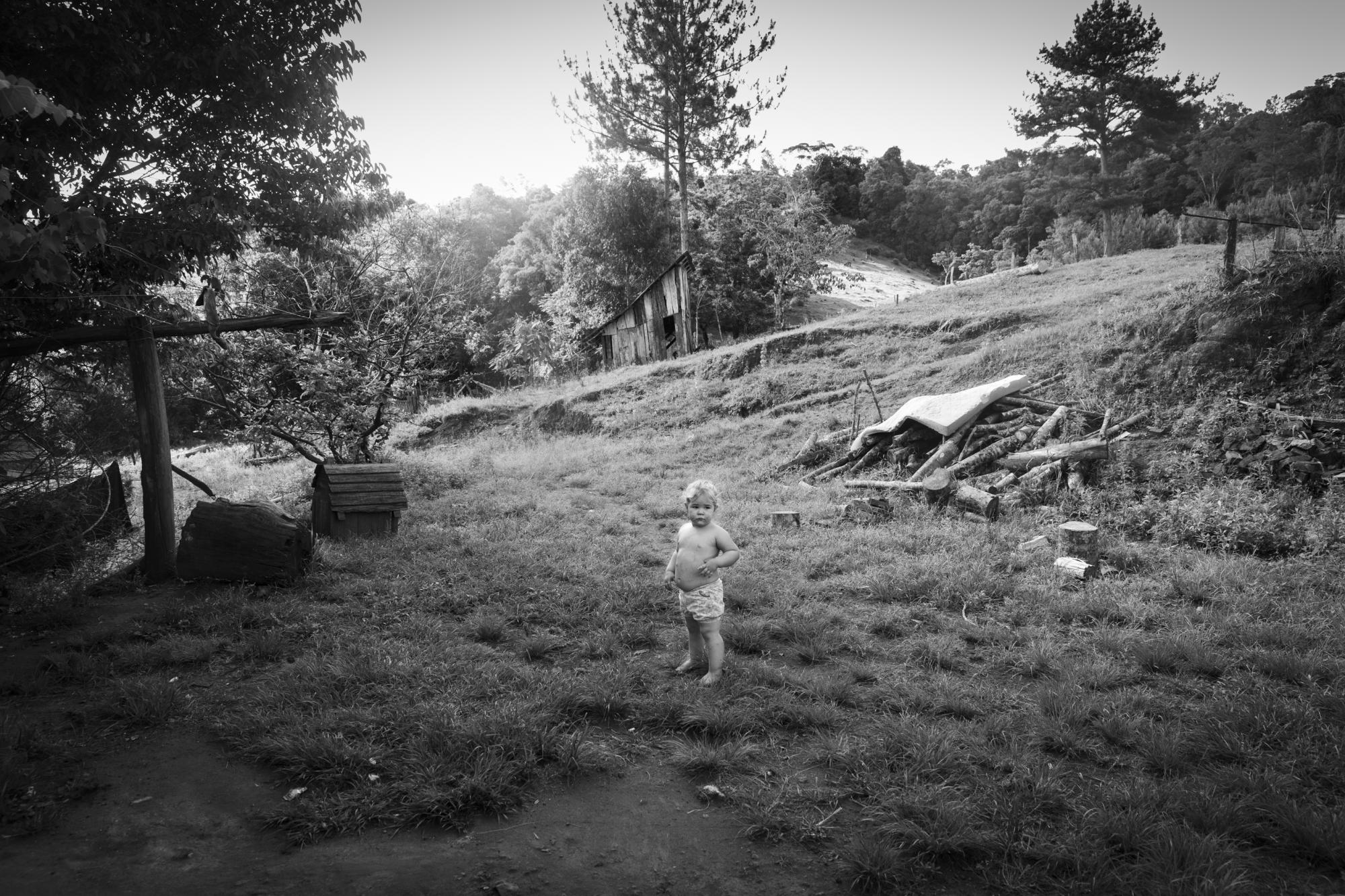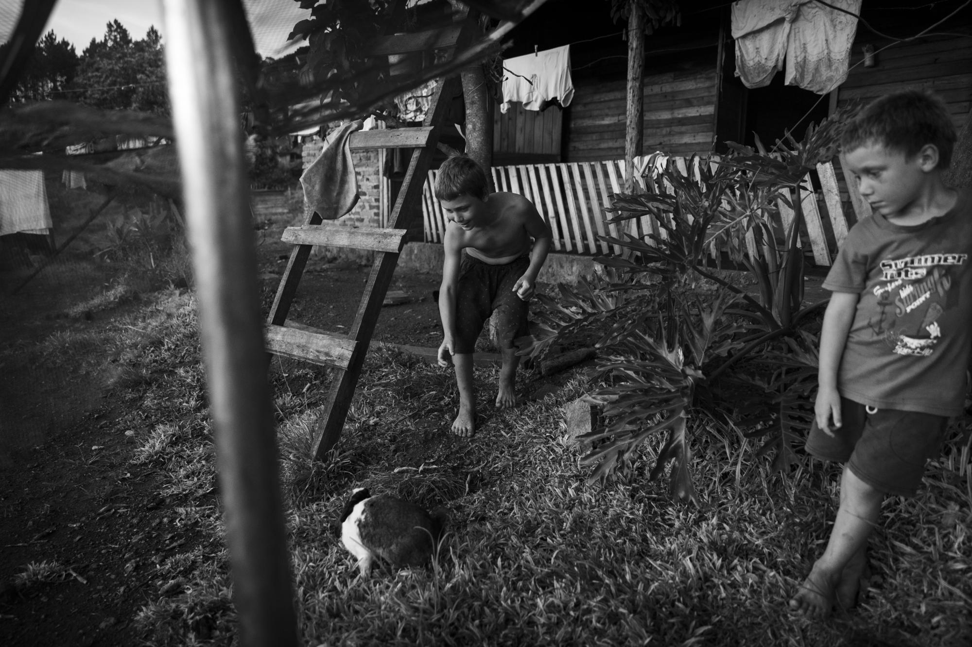 With the children we play, climb trees, harvest ""pitangas"", we ride oxen, watch cars that pass along the road. We cross streams on truck wheels, I watch them slaughter a cow they will later sell. The school bell rings and we walk together to their homes, eat some blackberries or medlars from the trees we find on the way. It is almost always hot and it rains.