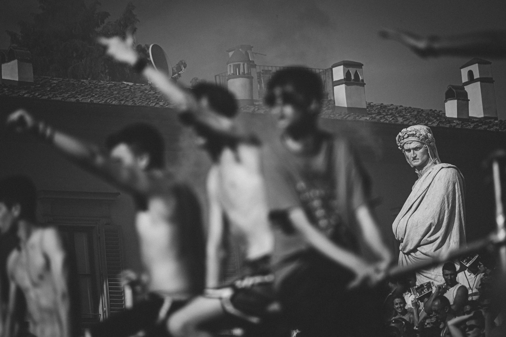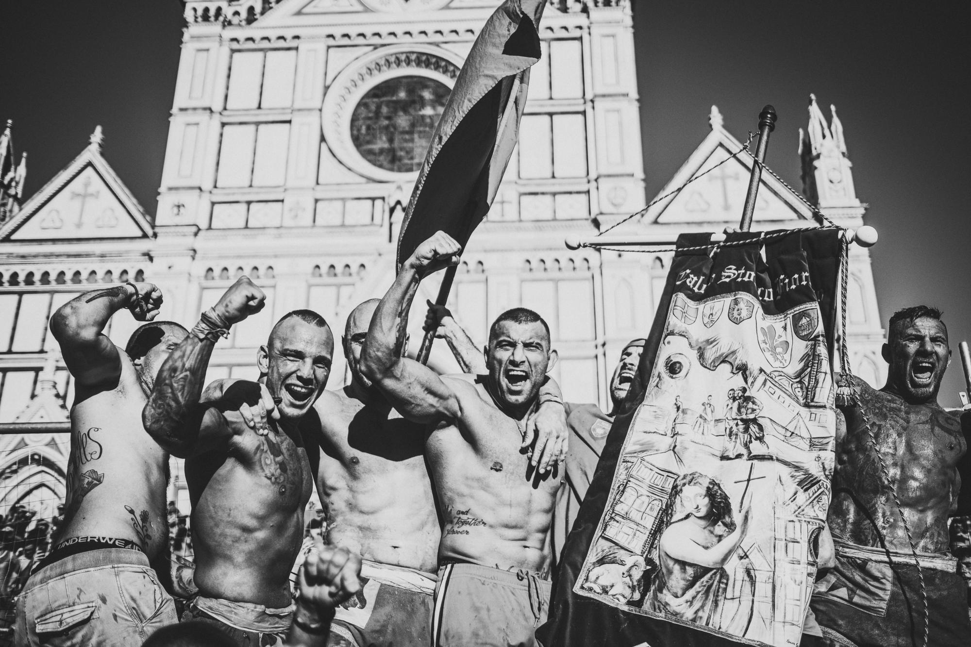 "Calcio fiorentino is a combination of rugby, football and wrestling, which originated in 16th-century Italy. Two teams of 27 players battle it out on a pitch covered in sand for a gruelling 50 minutes. It’s a brutal game and there are plenty of injuries - despite this, no substitutions are allowed. Players can use their hands and feet to trip up or tackle their opponents, and fighting techniques (such as martial arts) are permitted. These images were taken during the semi-finals and finals in 2019. The red team won the tournament by beating the white team in the final."