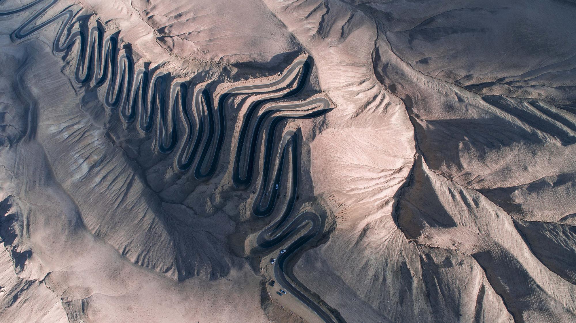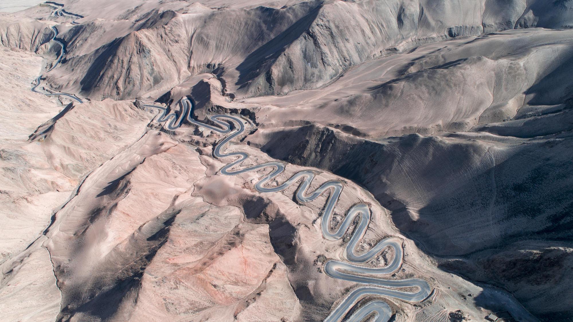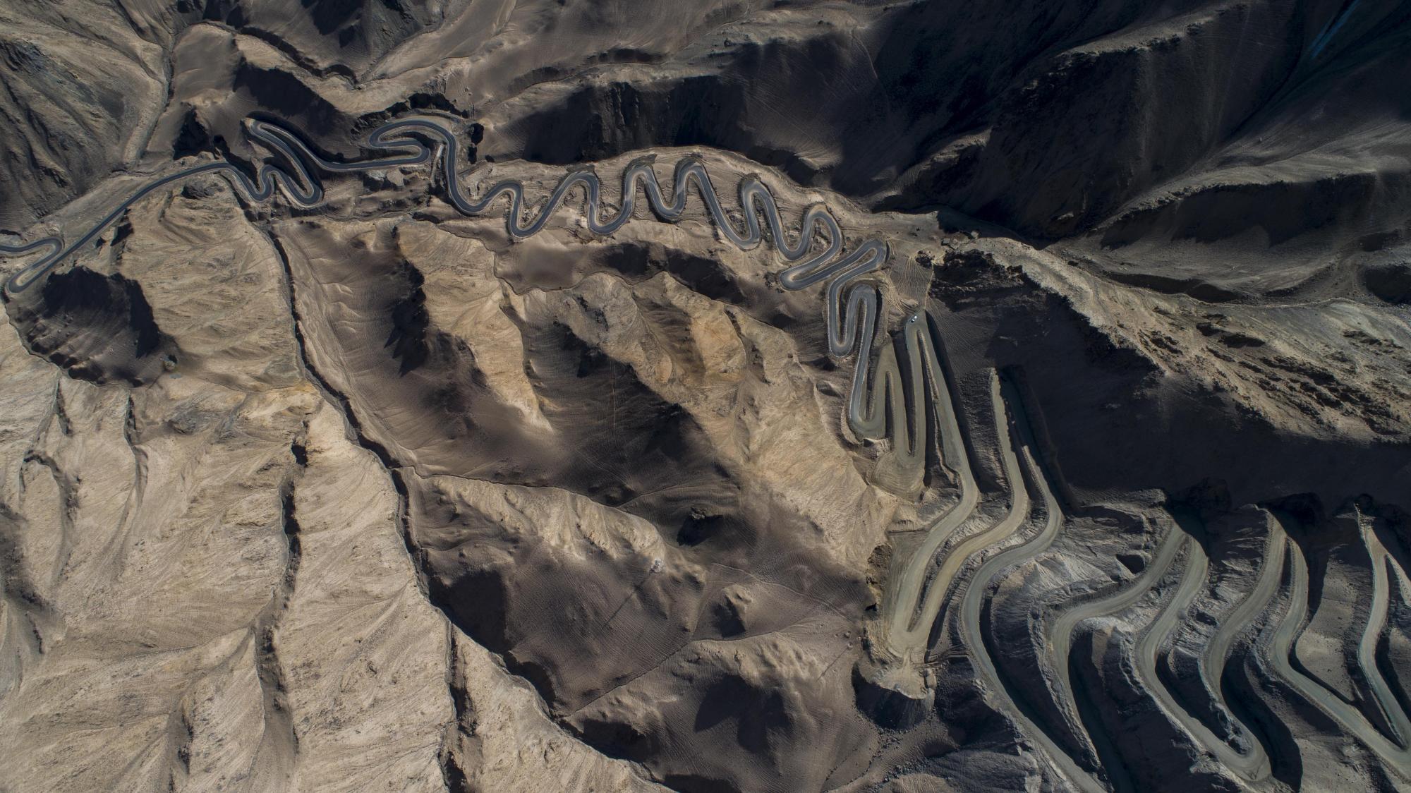 "In the Pamir Plateau of Xinjiang, China, there is a mountain road full of hairpin bends that connects Tashkurg Tajik Autonomous County and Wacha Township. This winding highway opened in July 2019, and runs for 36 kilometres. In places, it reaches an altitude of 4,200 metres above sea level, with a drop of 1,000 metres. Locals refer to it as the ‘plateau sky road’. These aerial images were taken between October and November 2019."