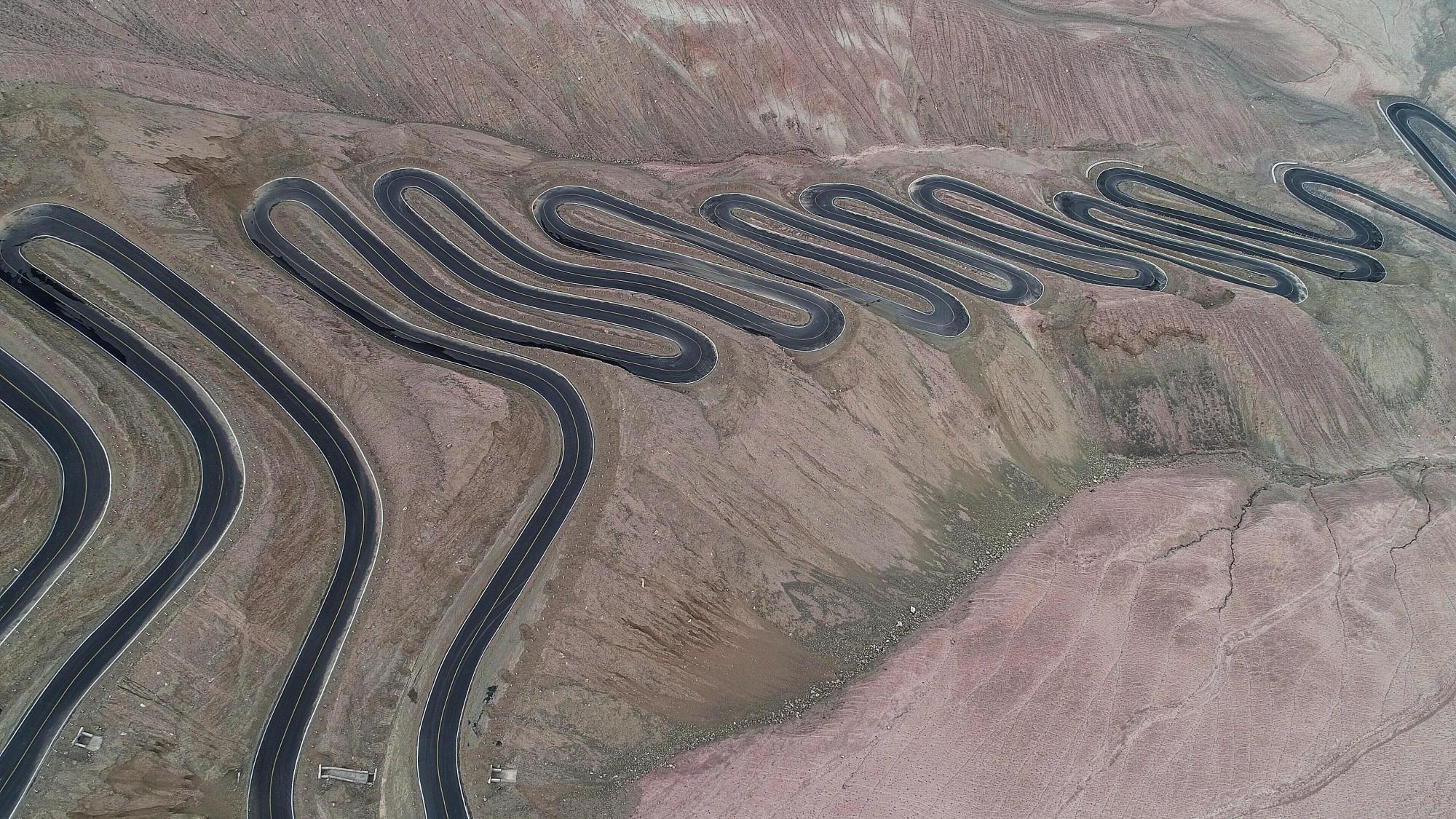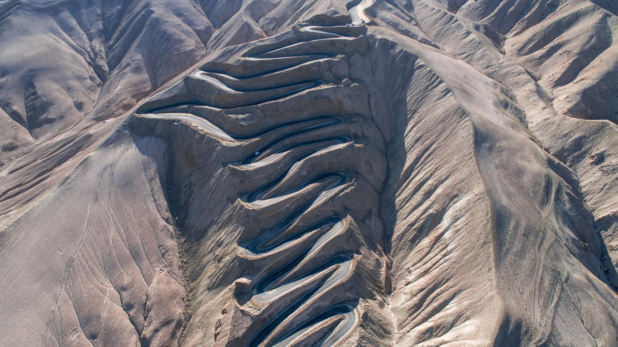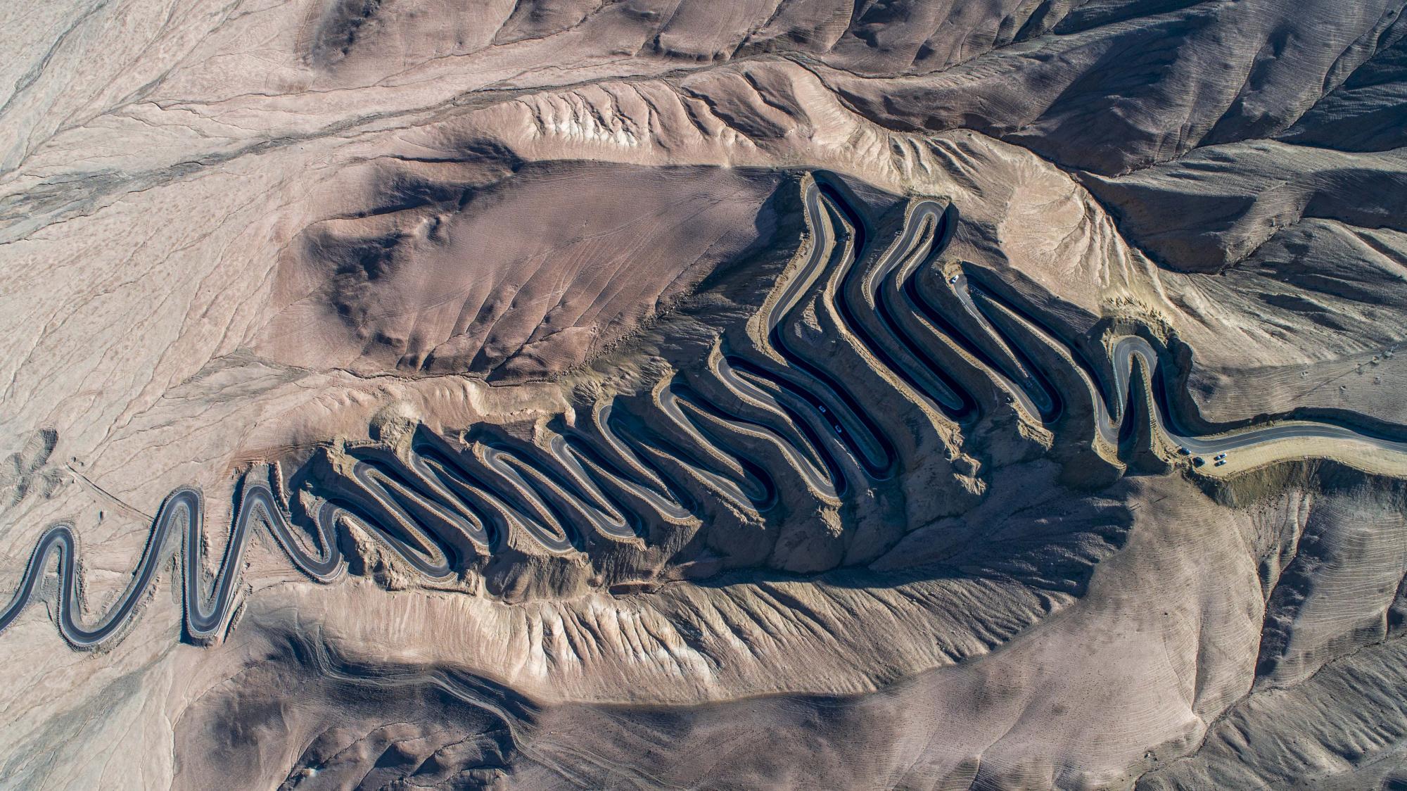 "In the Pamir Plateau of Xinjiang, China, there is a mountain road full of hairpin bends that connects Tashkurg Tajik Autonomous County and Wacha Township. This winding highway opened in July 2019, and runs for 36 kilometres. In places, it reaches an altitude of 4,200 metres above sea level, with a drop of 1,000 metres. Locals refer to it as the ‘plateau sky road’. These aerial images were taken between October and November 2019."