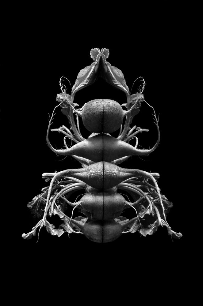 Specimen 07 is a photographic series in which the apparently defined boundaries between vegetal and animal are diluted and mixed together, giving birth to beings that originate in the imagination, and are created from vegetable fragments in my kitchen. These fragments lose their original identity, acquiring a new one when joined. This series shows the stages of development of one of these specimens."