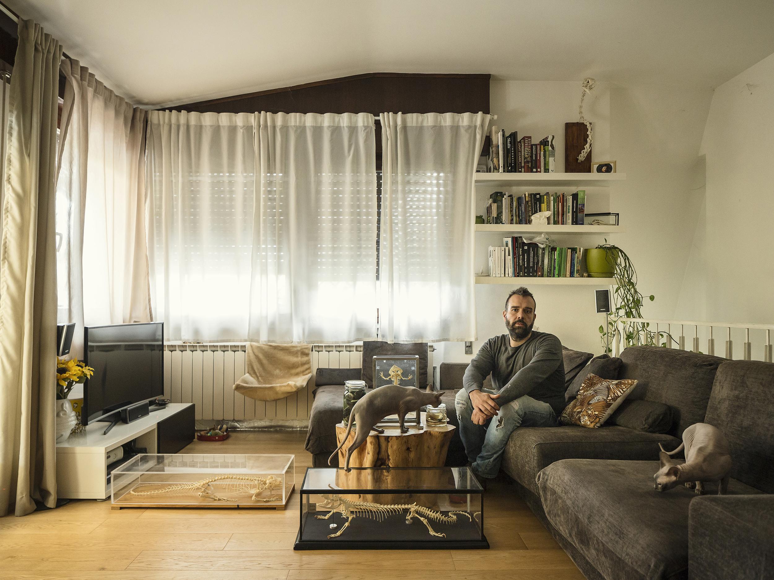 Lares is an ongoing project about our response to the death of our pets. I met several families who decided to keep the body of the animal they loved in their homes, embalmed, in the form of a skeleton, or in formalin. What may appear to be an anomaly is actually more widespread than might be imagined. In Roman civilisation Lares referred to the statues of the spirits of ancestors and protectors of home and family. Like those statues, dead animals are preserved in everyday places. And it's there that I wanted to set the family portraits.