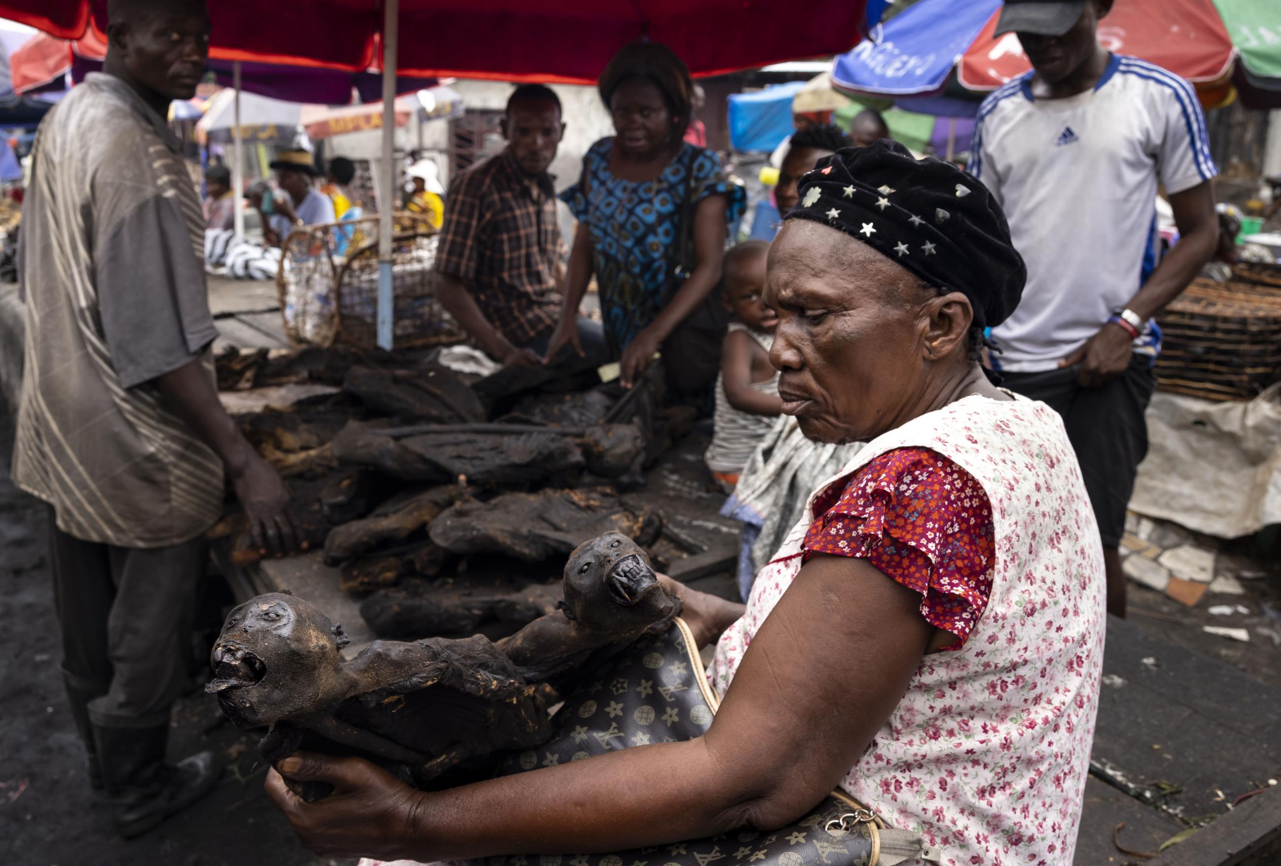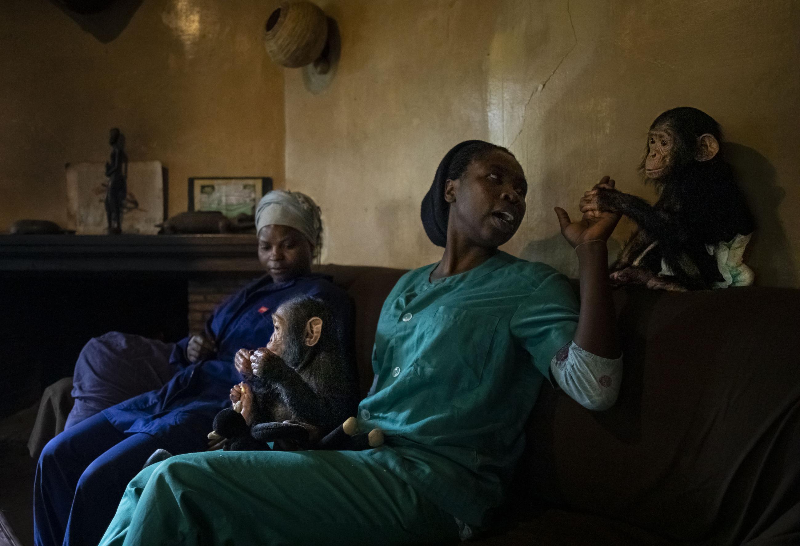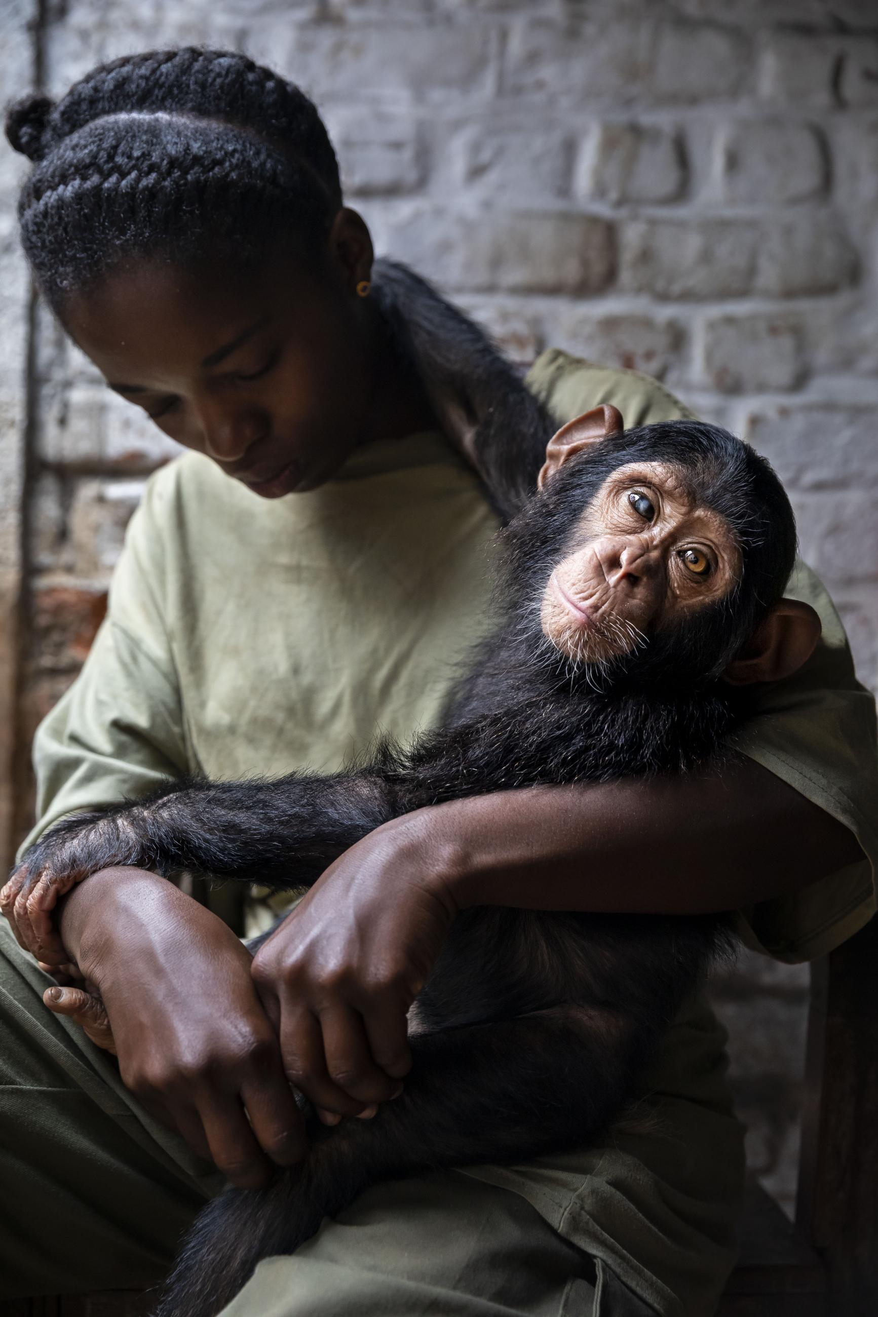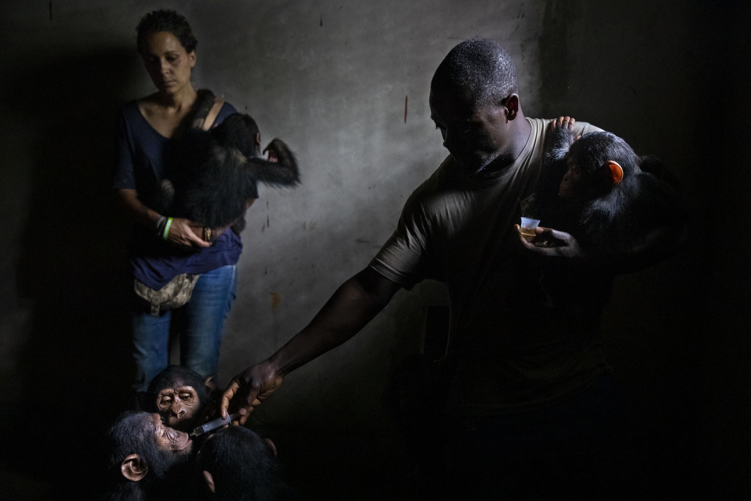 Rescuing and saving baby chimps is difficult. When they are taken by poachers, they are subject to tremendous trauma and abuse, and cannot access the nutrition they need to survive. The care required for their survival is similar to that needed by human babies – an often-exhausting 24/7 process. Many of the caregivers at this sanctuary are victims of the conflict; a number have been raped, displaced or wounded. They see the chimps as healing them as much as they are healing the chimps. The bushmeat trade in the Congo Basin is the largest in the world. Chimpanzees are often shot for the trade and their babies taken for possible sale. This essay attempts to show some of what is required to save those few chimps that are rescued, an estimated one in 10. We see this through the lens of rescue personnel, bushmeat markets, vets at work and Lwiro, a rescue sanctuary for chimps in a part of the Democratic Republic of Congo where conflict is a regular feature and wildlife is the last priority unless it can be eaten or sold.