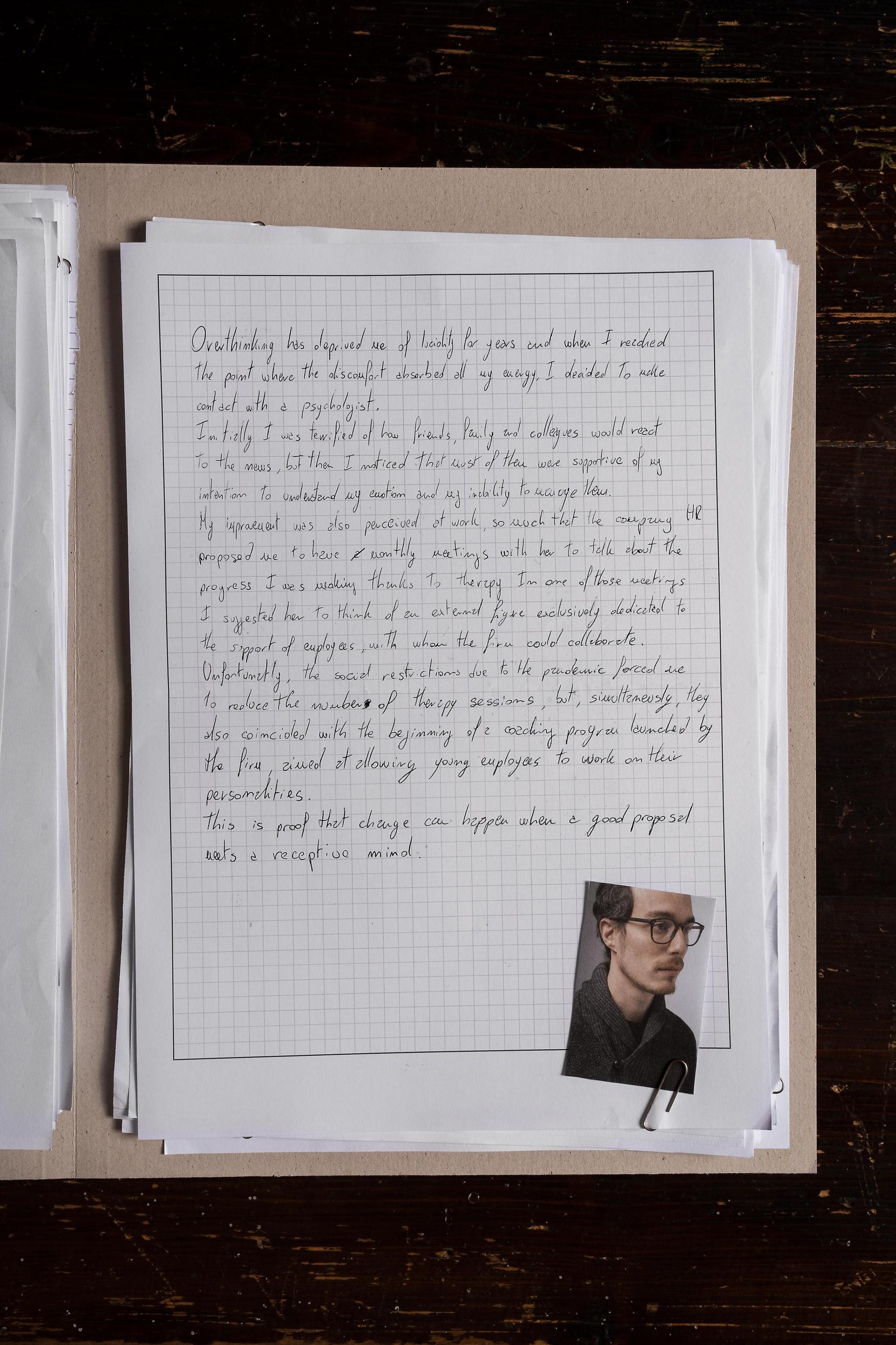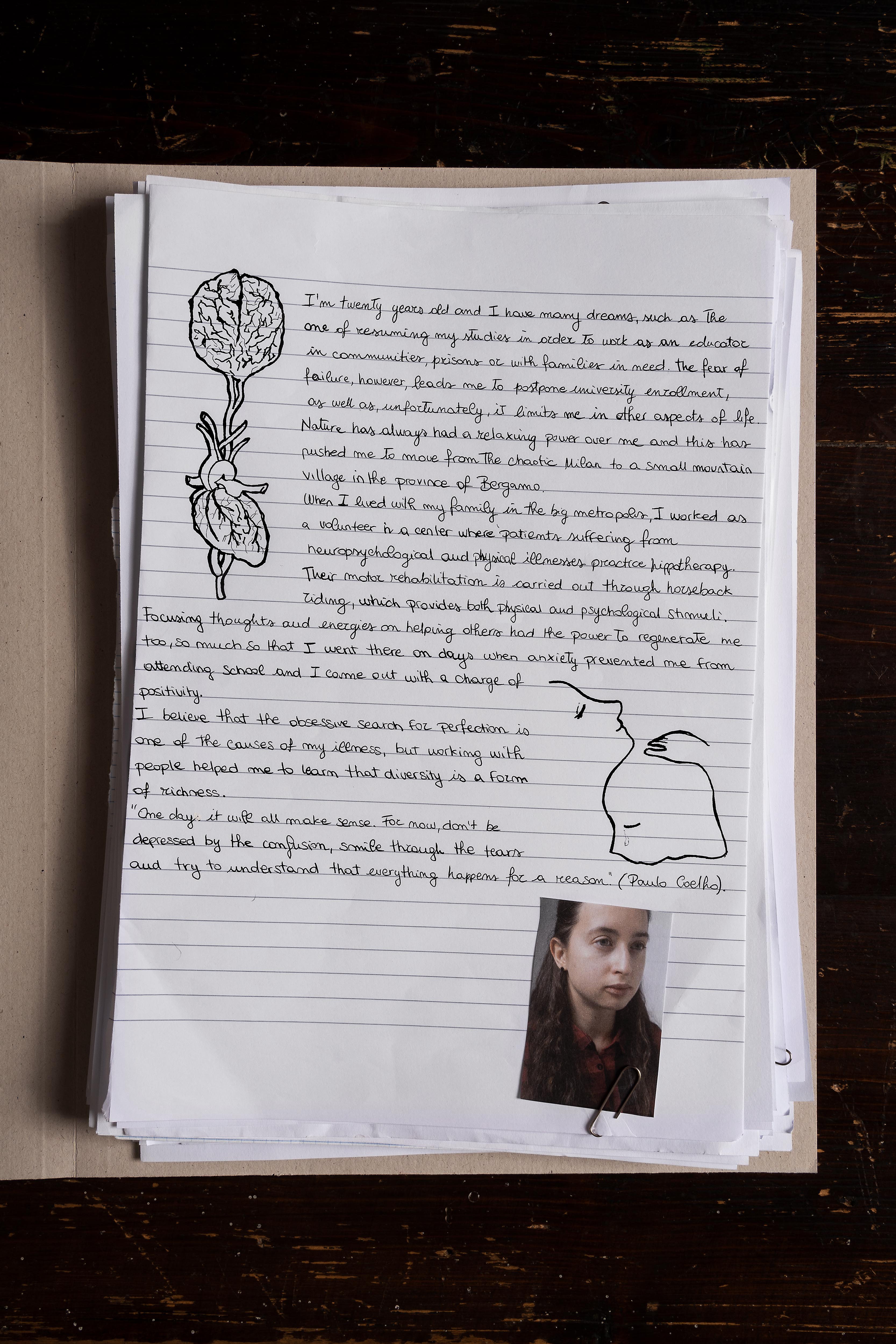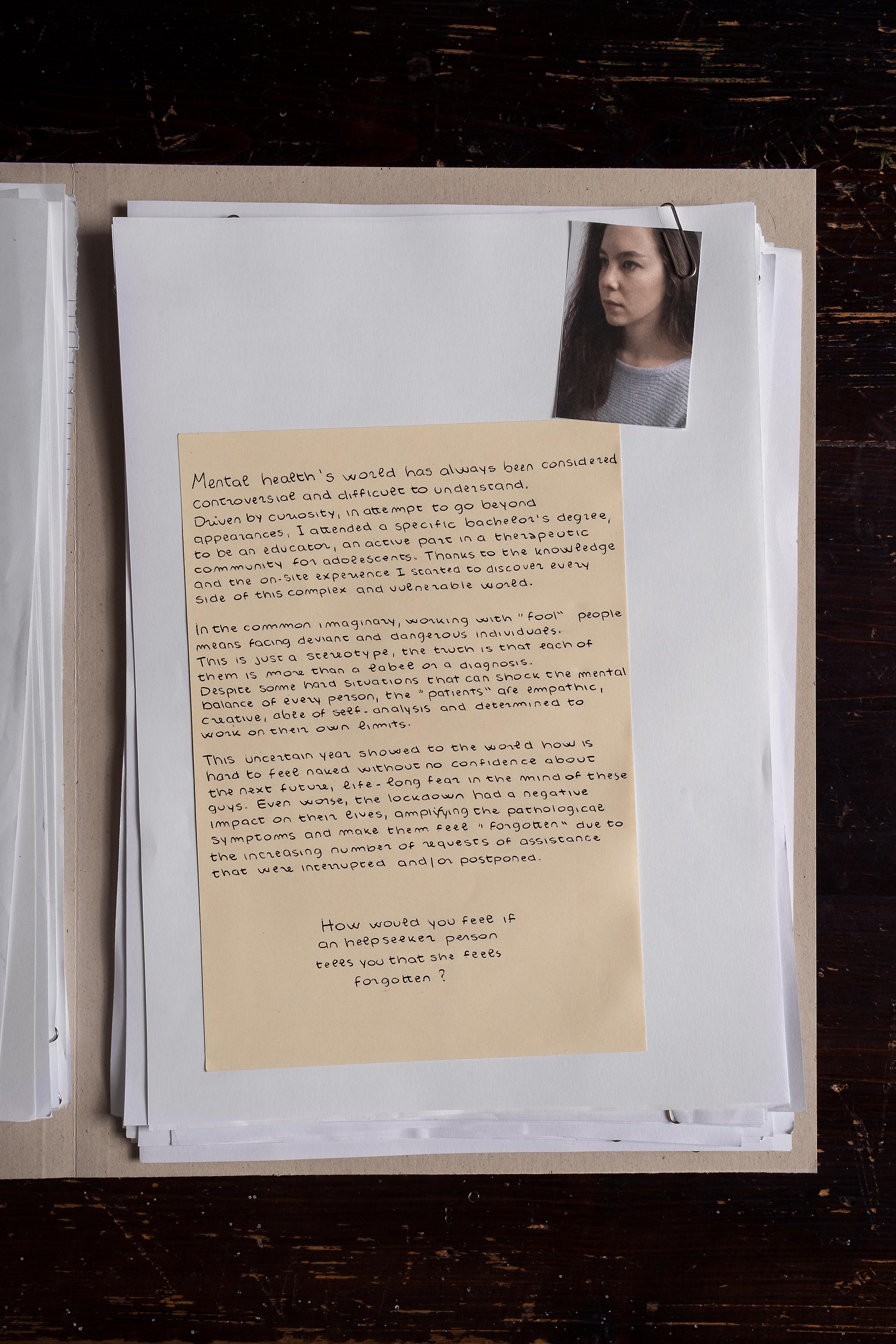 My project, presented in the form of an archive, features young Italians between the ages of 20 and 30, who, through their own testimonies, provide a general picture of modern society and mental health. As the WHO states, ‘Mental health is not just the absence of mental disorder. It is defined as a state of well-being in which every individual realizes his or her own abilities, can cope with the normal stresses of life, can work productively, and is able to make a contribution to her or his community.’
